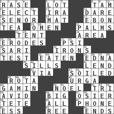 ACROSS 1. To erase 5. Car dealer's back yard 8. Scottish cap 11. Voters do this 13. Retirement account (abbr.) 14. Have the gumption 15. Sir (Sp.) 16. Floor protector 17. Inky black, to poets 18. Beverage made from leaves 19. Presage 21. Insides of hands 22. Portable shelter 24. Length times width 25. Eats (away) 27. Air pressure measure (abbr.) 29. Indian skirt 30. Removes the wrinkles 32. Trial 33. Eroded 35. Pulitzer Prize-winning author Ferber 39. Beverly of Met fame 41. Grant temporary use of 42. By way of 43. Dirtied 45. Round or rotation of duties 48. Capital and largest city of Mongolia 49. Homeless child 50. Christmas carol 52. Three (prefix) 55. Enthusiastic 56. Large 57. Flexible twig of a willow tree 59. False hair 60. 100% 61. Give a jingle 62. Double-curved letter 63. To riddle 64. Extremities DOWN 1. State of inaction 2. Toward shelter 3. Legislators 4. Environmental prefix 5. Welles in "The Third Man" 6. NW Algerian seaport 7. Make lace 8. Eating place 9. Odor 10. Not women's 12. Heavy duty weighing machine 14. Letter starter 20. Mountains (abbr.) 21. Ache 23. Proofreads 25. Eastern Standard Time (abbr.) 26. Actress Charlotte 27. Before (prefix) 28. Manchild 30. It is 31. Former Milwaukee Brewers owner Bud 33. Biblical high priest 34. According to 36. Accusation by an informer 37. Compass dir. 38. Say or write further 40. "Terrible" tsar 43. Take to court 44. Fourth or lowest deck 45. All-night dance parties 46. Leaves out 47. Periodic rise and fall of the sea level 49. Yard entry 50. The longest river in the world 51. Stare at amorously 53. Tear apart 54. Angers 56. Soap unit 58. A female animal or person