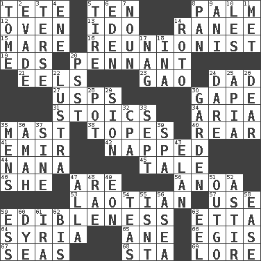 ACROSS 1. False hair 5. "___ Little Indians" 8. Inside of hand 12. Baking chamber 13. Wedding promise 14. Indian princess (variant) 15. Female horse 16. One who advocates reunion 19. Begley and Asner 20. Pre-World Series prize 21. Snakelike fish 23. E Mali city 24. June honoree 27. United States Postal Service (abbr.) 30. Open wide 31. Unemotional ones 34. Operatic vocal solo 35. Vertical spar for supporting sails 38. Drinks excessively 40. Hitchcock's "____ Window" 41. Independent ruler or chieftain 42. Slept 44. Grandmother 45. Falsehood 46. A female animal or person 47. "We ___ not amused" (Victoria) 50. Small Philippine buffalo 53. Of or relating to Laos or its people 57. Purpose 59. The property of being fit to eat 63. Singer James 64. Damascus' land 65. A saturated hydrocarbon 66. Armor plate that protects the chest 67. Oceans 68. R.R. building 69. Old wives' tales, e.g. DOWN 1. Heavy book 2. Elude 3. Laconic 4. Compass dir. 5. Hoop that covers a wheel 6. Genesis locale 7. Part of speech 8. Baking dish 9. Cuckoo 10. French article 11. Was introduced to 14. Printing process, for short 17. Tired old horse 18. _ tizzy (2 wds.) 20. Inconspicuous attention getter 22. A period of five years 24. Have the gumption 25. Capital of Western Samoa 26. Letter starter 28. Plant holder 29. The Jewish people; Israel 30. Place where plants grow 32. Tax preparer (abbr.) 33. Back-to-school mo. 35. Not women's 36. Wet nurse 37. Trig term 39. Health resort 43. Enthusiasm 47. Silent film actress Nazimova 48. Actress Charlotte 49. A really long time 51. Money paid out 52. Having gotten out of bed 54. Afternoon social gatherings 55. Is not 56. Toward the sea 58. Relaxation 59. Curvy letter 60. Color 61. Lyricist Gershwin 62. Altar cloth linen 63. Snakelike fish
