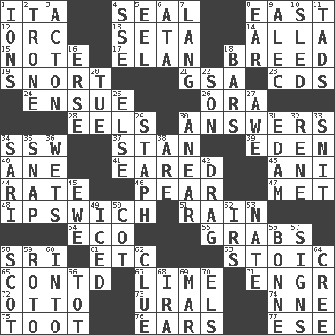 ACROSS 1. Call ___ day 4. Lick closed 8. Compass direction 12. The grampus (Milton) 13. Stalk of a moss capsule 14. Silent film actress Nazimova 15. Short letter 17. Style 18. A special lineage 19. Derisive sound 21. Girls' org. (abbr.) 23. Music discs 24. Take place subsequently 26. Mouth or opening 28. Snakelike fish 30. Responds (to) 34. Compass dir. 37. Comedian Laurel of Laurel & Hardy 39. Genesis locale 40. One (Scot) 41. Having ears or earlike features 43. Cuckoo 44. Assign a rank or rating to 46. Lightbulb-shaped fruit 47. Was introduced to 48. NE Massachusetts town 51. Precipitation 54. Environmental prefix 55. Catches 58. Indian title of respect (Mr.) 61. And so on (abbr.) 63. Unemotional 65. Continued (abbr.) 67. Welles in "The Third Man" 71. Engineer (abbr.) 72. Von Bismarck 73. Mountain range 74. Compass dir. 75. A blast of a horn 76. Hearing organs 77. Compass dir. DOWN 1. Charged atoms 2. Marketplace scale 3. NE Massachussets city 4. Compass dir. 5. Snakelike fish 6. _ moment's notice (2 wds.) 7. Austrian-born American filmmaker Fritz 8. Hearing organ 9. Actor Baldwin 10. Downhill vehicle 11. Small boys 16. Celtic language 18. Drinking establishments 20. Third day of the wk. 22. Male offspring 25. Otherwise 27. Deep reverence 29. Staphylococcus 30. Approach 31. Dutch treat 32. French philosopher Descartes 33. In a ____ (agitated or irritated) 34. Indian skirt 35. Fastener 36. Moistens 38. "We ___ not amused" (Victoria) 42. To draw with force 45. She-sheep 49. On the rocks 50. Small bed 52. Big collection agency 53. Nathan's nickname 56. Child's nurse 57. Public displays of written messages 58. Native of Scotland 59. Printing process, for short 60. To the inside or interior of 62. A slight indication 64. Algonquian 66. Small child 68. Retirement account (abbr.) 69. Third mo. 70. Raised railways