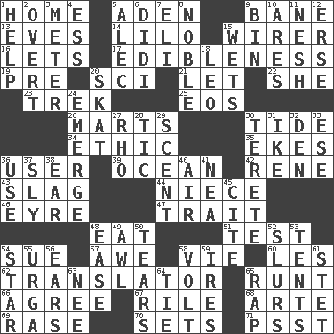 ACROSS 1. Residence 5. An important port of Yemen 9. Object of repulsion 13. Nights before holidays 14. _ and Stitch 15. One who wires 16. Allows 17. The property of being fit to eat 19. Before (prefix) 20. _-fi 21. Allow 22. A female animal or person 23. Long journey 25. Greek goddess of the dawn 26. Shops 30. Event that recurs at intervals 34. Value system 35. Makes supply last 36. One who uses or employs something 39. Sea 42. French philosopher Descartes 43. Volcanic refuse 44. Sibling's daughter 46. Jane of fiction 47. Distinguishing feature 48. Erode 51. Trial 54. Take to court 57. Deep reverence 58. Compete 60. French article 62. Interpreter 65. The smallest animal of a litter 66. Match 67. Cause heat under the collar 68. Johnson of "Laugh-In" 69. To erase 70. Arranges properly for use 71. Inconspicuous attention getter DOWN 1. Assist 2. Unconcealed 3. Distance measurement 4. Curvy letter 5. Actor Baldwin 6. "You Light Up My Life" star Conn 7. Connecticut Ivy Leaguer 8. Having high moral qualities 9. Storage container 10. Ancient Greek god of war 11. Delicate 12. Celtic language 15. Moistens 18. Lion 20. Three-handed card game 24. Develop 27. 17th letter of the Greek alphabet 28. Nervous spasm 29. Aroma 30. Cylindrical with tapered ends 31. D.D.E's nickname 32. Lair 33. Compass dir. 36. Purpose 37. Cunning 38. Ewer handle 40. Wind 41. Teachers' org. 45. Quote 48. Relaxation 49. Leather borer 50. Pulls into pieces 52. Runs notes together 53. Portable shelters 54. Play the lead 55. Capital and largest city of Mongolia 56. Hearing organs 58. Electrical Unit 59. Angers 61. Proofreading order 63. Born 64. Standoff 65. Hit sharply and swiftly