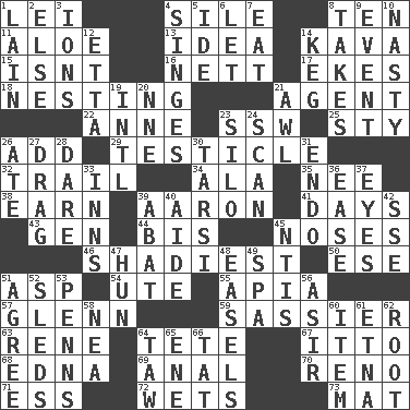 ACROSS 1. Luau accessory 4. Drop; flow; fall 8. Nine, plus one 11. _ vera 13. The main thing one is thinking about 14. Polynesian shrub of the pepper family 15. Is not 16. Remaining after all deductions 17. Supplements with great effort 18. Inhabiting a nest 21. Rep 22. Queen of England 1702-14 23. Compass dir. 25. Filthy place 26. Say or write further 29. One of the two male reproductive glands 32. Lag or linger behind 34. Chicken ___ king 35. Born 38. Merit 39. Composer Copland 41. 24-hour periods 43. Commissioned military rank (abbr.) 44. Twice 45. Olfactory organs 46. Most dark, concealed or hidden 50. Compass dir. 51. Cleo's killer 54. Shoshoni 55. Capital of Western Samoa 57. American astronaut and politician John 59. More disrespectful 63. French philosopher Descartes 64. False hair 67. "Tell ____ the Marines!" 68. Pulitzer Prize-winning author Ferber 69. Of or related to the anus 70. Former U.S. Attorney General Janet 71. Double-curved letter 72. Soaks 73. Floor covering DOWN 1. (Had) reclined 2. Otherwise 3. Charged particles 4. Scorches 5. Binary compound 6. Allow 7. Ingest 8. Receives possession of 9. Incident 10. Smutty 12. Singer James 14. Cask 19. International (abbr.) 20. Compass dir. 21. Leather borer 23. Grain storage tower 24. Skim 26. Had dinner 27. To draw with force 28. Have the gumption 30. Tarsus (plural) 31. Inside; within (prefix) 33. Taverns 36. Comfort 37. Sight organs 39. Blind as ____ 40. Assistant 42. Compass dir. 45. Nuclear Threat Initiatives 47. Attila the _ 48. Artist's stands 49. Health resort 51. Match 52. Bobsleighs 53. Actor Sean's family 56. SW Saudi Arabia district 58. Teachers' org. 60. A distinct part 61. Inactive volcano in Sicily 62. Carrot, for example 64. The 23rd letter of the Hebrew alphabet 65. Compass dir. 66. Make lace
