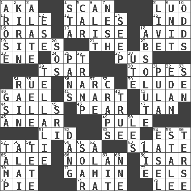 ACROSS 1. Alias (abbr.) 4. Examine minutely or intensely 8. Nilotic language 11. Cause heat under the collar 13. Falsehoods 15. Indiana (abbr.) 16. Mouths or openings 17. Get up 18. Enthusiastic 19. Locates 21. Definite Article 22. Wagers 23. Compass dir. 24. Choose 27. Ichor 29. Russian ruler of old 30. Drinks excessively 34. Regret 36. Drug cop 39. Evade 40. Highlander 41. Don Adams' spy role 43. ____ Bator, Mongolia 44. Beverly of Met fame 46. Lightbulb-shaped fruit 47. Scottish cap 48. Approach 49. Whimper 51. Flaplike covering 53. Perceive with the eye 54. Eastern Standard Time (abbr.) 57. Jacques of French films 60. White ___ sheet 63. Schedule 65. Toward shelter 66. Pitcher Ryan 69. Austrian river, tributary to the Danube 70. Floor protector 71. Street urchin 72. Snakelike fish 73. Sliced dessert 74. Pace 75. Area sheltered from the wind DOWN 1. Came up 2. Japanese brewing company 3. Having winglike extensions 4. R.R. building 5. 4-wheeled motor vehicle 6. Set down 7. Soft 8. Not recorded 9. A single undivided whole 10. Likelihood 12. Compass dir. 14. Ooze 18. Utter; complete 20. Mayday 25. Zero-star reviews 26. _____ steamer (cargo ship) 28. Shoshoni 29. Copy Pinocchio 31. Monetary unit of Botswana 32. Dutch treat 33. Elected rep. 34. Precipitation 35. Ubangi River tributary 37. Actress Charlotte 38. Dice game 40. Girls' org. (abbr.) 42. Loyal 45. Indian title of respect (Mr.) 50. French article 52. Mild oath, euphamism for damn 54. Artist's stand 55. Showing deterioration from age 56. Laconic 57. Pack (down) 58. Mountain range southwest of Kyrgyzstan 59. False hair 61. Fly high 62. _ mater 64. Untruth 67. Small island 68. Compass dir.