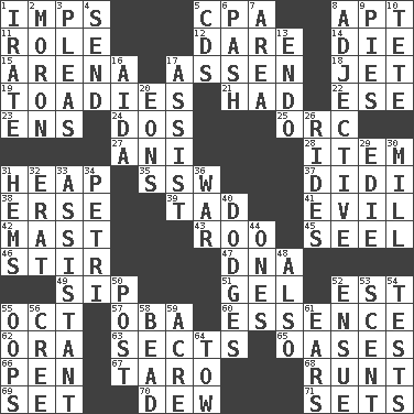 ACROSS 1. Naughty children 5. Numbers guy (abbr.) 8. Fitting 11. Hero or heavy, e.g. 12. Have the gumption 14. Expire 15. Sports stadium 17. NE Netherlands city 18. Passenger plane 19. Sycophants 21. Possessed 22. Compass dir. 23. Followers of ems 24. Two (Sp.) 25. The grampus (Milton) 27. Cuckoo 28. A distinct part 31. Pile 35. Compass dir. 37. "You Light Up My Life" star Conn 38. Celtic language 39. Bit 41. Tending to cause great harm 42. Vertical spar for supporting sails 43. Friend of Pooh 45. Stitch closed the eyes of (a falcon) 46. Use a swizzle stick 47. Heredity factor (abbr.) 49. Small drink 51. Set 52. Eastern Standard Time (abbr.) 55. Sep. follower 57. Chief or king in Benin or Nigeria 60. Core 62. Mouth or opening 63. Religious groups 65. Fertile tracts in a desert 66. Animal enclosure 67. Edible starchy tuberous root 68. Undersized animal 69. Put into a specified state 70. Morning condensation 71. Arranges properly for use DOWN 1. Feeling or showing extreme anger 2. Person of subnormal intelligence 3. Entreaties 4. Post 5. Music discs 6. Romantic infatuation 7. Type of rug 8. Descriptive word 9. Sliced desserts 10. Wig 13. Inside; within (prefix) 16. Opera by Verdi 17. Help 20. Immeasurably long periods of time 26. Amusement-park features 29. Singer Brickell 30. Place where flour is made 31. Equivocates 32. Part of Q.E.F. 33. Helper 34. _ dish (used to culture cells) 36. Armed conflict 40. Evades 44. Singles 48. In addition 50. Mail 52. Take place subsequently 53. Aroma 54. Trials 55. I made a mistake 56. Algonquian 58. Necklace unit 59. 1/640 square mile 61. Hearing organs 64. Pull behind