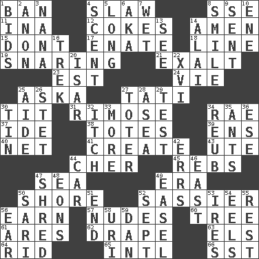 ACROSS 1. Forbid 4. Cole _ (cabbage dish) 8. Compass dir. 11. _ tizzy (2 wds.) 12. Popular sodas 14. So be it 15. Do not 17. Related on the mother's side 18. Actor's bit 19. Catching in a trap 21. Honor 23. Eastern Standard Time (abbr.) 24. Compete 25. "____ silly question..." 27. Jacques of French films 30. Teat (slang) 31. Full of chinks, cracks, or crevices 34. Actress Charlotte 37. Binary compound 38. Lugs 39. Followers of ems 40. Fish or hair follower 41. Cause to be 43. Shoshoni 44. "Mermaids" star 45. Confederate soldiers (slang) 47. Ocean 49. Period 50. Dinah or Pauly 52. More lively and spirited 56. Merit 57. Unclothed pictures 60. Family _ (genealogy) 61. Ancient Greek god of war 62. Window treatment 63. Raised railways 64. To free from 65. International (abbr.) 66. Fast jet (abbr.) DOWN 1. Auction offers 2. At once, immediately (arch.) 3. Grandmother 4. Odor 5. Yearn 6. Alias (abbr.) 7. Soggy 8. Grin 9. Transmitted 10. Compass dir. 13. Perceive with the eye 14. Jai _ 16. Long journey 20. Austrian river, tributary to the Danube 22. 16 25. Helper 26. Proofreading order 27. Carrier 28. Toward the sea 29. Trial 30. Metal container 32. Hankering 33. Greater amount 34. Reuben's nickname 35. Pismires 36. Compass dir. 42. Blunders 44. 4-wheeled motor vehicle 46. Compass direction 47. Fragment 48. Immeasurably long periods of time 49. Artist's stand 50. Indian skirt 51. Conclude 52. Back-to-school mo. 53. Angers 54. Snakelike fish 55. Repose 56. Hearing organ 58. RI univ. 59. Daniel's nick name