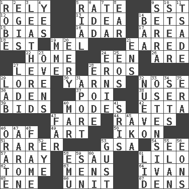 ACROSS 1. Depend 5. Pace 9. Fast jet (abbr.) 12. Double curve, resembling the letter S 13. It may be bright or harebrained 14. Stakes 15. Prejudice 16. The sixth month of the Jewish calendar 17. Type of rug 18. Eastern Standard Time (abbr.) 19. Cartoonist voice _ Blanc 21. Having ears or earlike features 22. Residence 24. Car or cant ending 26. "We ___ not amused" (Victoria) 27. Crowbar 28. Greek god of love 29. Old wives' tales, e.g. 30. Tall tales 32. Sense of smell 36. Arabian gulf 37. Luau course 38. One who uses or employs something 39. Auction offers 40. Methods 42. Singer James 43. Conductor's collection 44. All-night dance parties 46. Clumsy lout 49. Nonscientific branch of learning 50. Picture 51. More valued for its uncommonness 53. Girls' org. (abbr.) 54. Perceive with the eye 57. Like ___ of sunshine 58. He sold his birthright 61. _ and Stitch 62. Heavy book 63. Not women's 64. _ the terrible 65. Compass dir. 66. A single undivided whole 67. Habitations of wild animals DOWN 1. Loose flowing garment 2. The front part of a cuirass 3. Resembling or made to resemble leather 4. Consenting reply 5. Monetary unit of Yemen 6. Say or write further 7. Beverage made from leaves 8. Hearing organ 9. Father Junipero _ 10. Navigate 11. Sadhe (variant) 14. Sound made by sheep 19. Madame (abbr.) 20. Suggestive of the supernatural 21. Followers of ems 23. Baking chambers 24. Bert's buddy 25. Greek goddess of the dawn 27. Farming town in central California 28. Wear away 29. Experiment locale 31. To the left, to Queeg 32. New (sp.) 33. Clearly or manifestly demonstrative 34. Puts into a specified state 35. Epoch 40. Third mo. 41. Indian titles of respect 43. Distant 45. Alias (abbr.) 46. Declaim 47. Composer Copland 48. Movie unit 52. Sight organ 53. Abrupt rush of wind 55. Style 56. Immeasurably long periods of time 58. Australian flightless bird 59. Elected rep. 60. Black tropical American cuckoo 61. Flaplike covering