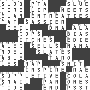 ACROSS 1. Oscar Madison type 5. Parent Teacher Association (abbr.) 8. Turn sharply 12. Hoop that covers a wheel 13. Mouth edge 14. Confronts 15. Enthusiasm 16. Pleas 19. Make lace 20. More disrespectful 21. To provide with a ceiling 23. Heredity factor (abbr.) 24. Insect wing 27. 911 reaches them 30. Prejudice 31. Irritating cutaneous sensations 34. Singer Brickell 35. Actor Baldwin 38. Makes a sale 40. Nanny 41. Christmas carol 42. Chalkboards 44. Competent 45. Pacific island yam 46. French article 47. Atlas unit 50. In a ____ (agitated or irritated) 53. Stimulate to action 57. Actress Charlotte 59. Supplying deficiencies 63. Root beer relative 64. Slow-paced one 65. Baking dish 66. Singles 67. Event that recurs at intervals 68. Conclude 69. Inconspicuous attention getter DOWN 1. Proofreading order 2. Pale purple color 3. Declaim 4. Benjamin's nick name 5. Entreaty 6. Canisters 7. Tenement units (abbr.) 8. Arrange properly for use 9. Flowery wreath 10. Shoshoni 11. Curvy letter 14. Hindu Mythology: god of death 17. To free from 18. Car or cant ending 20. Narrow, elongated depression 22. Ice on the eave 24. Opera by Verdi 25. (Had) reclined 26. Toward the sea 28. Personal Computers (abbr.) 29. "______ My Girl" (Turtles hit) 30. Gillaume's butler role 32. Pipe bend 33. Narrow board 35. Of or related to the anus 36. Ear part 37. Snakelike fish 39. R.R. building 43. Celtic language 47. Place where flour is made 48. One (Scot) 49. Pacific Standard Time (abbr.) 51. Metal shackles 52. Falsehoods 54. Corncob 55. _ the terrible 56. Tear apart 58. 90 degrees 59. Fast jet (abbr.) 60. University (slang) 61. Writing tablet 62. Sliced dessert 63. Police officer (slang)
