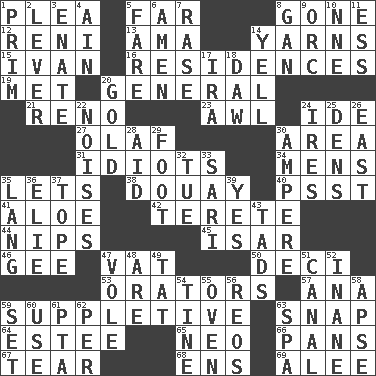 ACROSS 1. Entreaty 5. At a great distance 8. Went 12. Painter Guido (1575-1642) 13. Nursemaid (var.) 14. Entertaining tales 15. _ the terrible 16. Dwellings 19. Was introduced to 20. Commissioned military rank 21. Former U.S. Attorney General Janet 23. Leather borer 24. Binary compound 27. Norwegian king 30. Length times width 31. Foolish or stupid persons 34. Not women's 35. Allows 38. A city in N France, SE of Calais 40. Inconspicuous attention getter 41. _ vera 42. Cylindrical with tapered ends 44. Pinches, bites 45. Austrian river, tributary to the Danube 46. Unit of force equal to gravity 47. Large container 50. Tenth: prefix 53. Speakers 57. Santa ___, CA 59. Supplying deficiencies 63. Fastener 64. First name in cosmetics 65. Modern: prefix 66. Baking dishes 67. Lacerate 68. Followers of ems 69. Toward shelter DOWN 1. Demure 2. Crowbar 3. Maternal 4. The 18th letter of the Arabic alphabet 5. Conductor's collection 6. So be it 7. Raze (variant) 8. Separate the seeds from cotton 9. The grampus (Milton) 10. Compass dir. 11. Curvy letter 14. Shout 17. Retirement account (abbr.) 18. Obsolete 20. Aureate 22. Annoying sounds 24. Angers 25. Cub Scout units 26. 90 degrees 28. Assist 29. 12 inches 30. Electrical Unit 32. Third day of the wk. 33. Indian skirt 35. Austrian-born American filmmaker Fritz 36. Writer Wiesel 37. Drink excessively 39. Consenting reply 43. Bits 47. Grand slam 48. "We ___ not amused" (Victoria) 49. Make lace 51. Lessep's creation 52. Lacking in sense or substance 54. Prong on a fork 55. Baking chamber 56. Vintage cars 58. Domed church section 59. Put into a specified state 60. Purpose 61. Parent Teacher Association (abbr.) 62. For each 63. Health resort