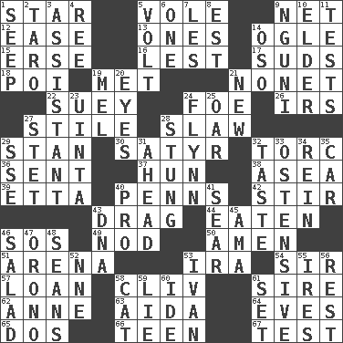 ACROSS 1. Play the lead 5. Short-tailed, large-bodied rat 9. Fish or hair follower 12. Relaxation 13. Washington bills 14. Stare at amorously 15. Celtic language 16. For fear that 17. Soap bubbles 18. Luau course 19. Was introduced to 21. Music written for nine 22. Chop _ 24. Enemy 26. Big collection agency 27. Vertical member of a panel or frame 28. Cole _ (cabbage dish) 29. Comedian Laurel of Laurel & Hardy 30. Letch 32. Torque (variant) 36. Posted 37. Attila the _ 38. At sea 39. Singer James 40. Actor Sean's family 42. Use a spoon 43. To be drawn or hauled along 44. Consumed 46. Distress signal 49. Dreamland 50. So be it 51. Sports stadium 53. Lyricist Gershwin 54. Title for a knight 57. Grant temporary use of 58. 154 in Roman numerals 61. The founder of a family 62. Queen of England 1702-14 63. Opera by Verdi 64. Nights before holidays 65. Two (Sp.) 66. Adolescent 67. Trial DOWN 1. Ooze 2. Edible starchy tuberous root 3. Aide 4. To riddle 5. Electrical Unit 6. Single 7. French article 8. Eastern Standard Time (abbr.) 9. Group of southern Bantu languages 10. A person who is older than you are 11. Trials 14. Bear (Spanish) 19. Cartoonist voice _ Blanc 20. Sight organs 21. ___ Haven, CT 23. National forest in Provo, Utah 24. Film actor Errol 25. Rowing implement 27. Proofreading order 28. Feeling sharp psychological pain 29. Compass dir. 31. Having the leading position 32. Clothes sense 33. Clearly or manifestly demonstrative 34. It's straight from the horse's mouth 35. Automobile 40. Adept person 41. Shrivel 43. Heredity factor (abbr.) 45. Nursemaid (var.) 46. Vegetable dish 47. U. of Maine site 48. Actors Connery and Penn 52. Compass dir. 53. "Terrible" tsar 55. Angers 56. State of inaction 58. Domesticated feline 59. Falsehood 60. Binary compound 61. Arrange properly for use