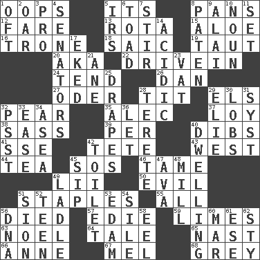 ACROSS 1. I made a mistake 5. It is 8. Baking dishes 12. Conductor's collection 13. Roll call or roster of names 15. _ vera 16. Heavy duty weighing machine 18. Ketch in the Levant 19. Strained 20. Alias (abbr.) 22. Popular '50s hangout 24. Watch over 26. One of the 12 tribes of Israel 27. River in Europe 28. Teat (slang) 29. Raised railways 32. Lightbulb-shaped fruit 35. Actor Baldwin 37. Myrna of the movies 38. Backtalk 39. For each 40. Rights 41. Compass dir. 42. False hair 43. Compass direction 44. Beverage made from leaves 45. Distress signal 46. Docile 49. Cards in a Roman deck? 50. Morally bad or wrong 51. Paper fasteners 55. Everything 56. Passed on 57. Singer Brickell 59. Citrus fruits 63. Christmas carol 64. Story 65. Political cartoonist Thomas 66. Singer Murray 67. Cartoonist voice _ Blanc 68. Jennifer or Joel DOWN 1. Often (poetically) 2. Rowing implement 3. Adept person 4. Legislators 5. Big collection agency 6. Frog relative 7. Agitate 8. Eucharist need 9. Jai _ 10. Part of speech 11. Arrange properly for use 14. Being or containing an acid 17. Supplemented with great effort 21. A saturated hydrocarbon 23. Large container 25. Window treatments 28. Cigar-shaped 29. Writer Wiesel 30. Tennis shots 31. System (abbr.) 32. Inconspicuous attention getter 33. Relaxation 34. Toward the sea 36. Allow 40. Home 42. Bathroom 45. Small drink 47. Actress Gardner 48. Place where flour is made 49. Dipping utensil 51. The Jewish people; Israel 52. Adolescent 53. Dutch treat 54. Filth; sediment 56. Heredity factor (abbr.) 58. Snakelike fish 60. Spoil 61. Compass dir. 62. Filthy place