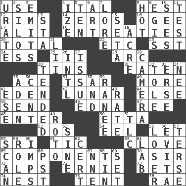 ACROSS 1. Purpose 4. Slanted text style (abbr.) 8. Command 12. Basketball hoops 14. Nothings 16. Double curve, resembling the letter S 17. Set down 18. Pleas 20. "_____ Recall" 22. And so on (abbr.) 23. Fast jet (abbr.) 24. Double-curved letter 25. One more than two 28. Curve 30. Canisters 31. Consumed 35. Adept person 37. Russian ruler of old 40. Greater amount 41. Genesis locale 42. Type of eclipse 44. Otherwise 45. Transmit 46. Pulitzer Prize-winning author Ferber 47. To riddle 48. Keyboard key 50. Singer James 52. Two (Sp.) 54. Snakelike fish 55. Allow 58. Indian title of respect (Mr.) 61. Nervous spasm 63. Garlic unit 65. Parts 70. SW Saudi Arabia district 71. High mountains 72. Bert's buddy 73. Antes 74. Egg locale 75. Portable shelter 76. Actress Charlotte DOWN 1. A salt of uric acid 2. Grain storage towers 3. Gives off 4. Ending with capital 5. "___ Little Indians" 6. Tate display 7. Old wives' tales, e.g. 8. Being at a high temperature 9. The front part of a cuirass 10. Observes 11. Trial 13. R.R. building 15. Bristle 19. 1/640 square mile 21. Cards in a Roman deck? 26. International (abbr.) 27. Come out of 29. Device for capturing images 30. Looked after 32. Lacquered or enameled metalware 33. Celtic language 34. Born 35. An important port of Yemen 36. Penny 38. Also 39. The wife of a rajah (variant) 41. Compass dir. 43. Pace 49. Printing process, for short 51. Affectionate concern, for short 53. Trig term 55. Failure 56. Webber/Rice musical 57. Laconic 58. Examine minutely or intensely 59. Hero or heavy, e.g. 60. Naughty children 62. Sure thing 64. Experiment locale 66. Pacific Standard Time (abbr.) 67. Compass dir. 68. Metal container 69. Arrange properly for use