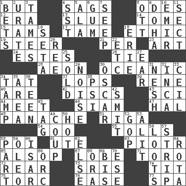 ACROSS 1. Yet 4. Sinks 8. Lyric poems 12. Epoch 13. Change direction abruptly 14. Heavy book 15. Scottish caps 17. Docile 18. Principle of right and wrong 19. Guide 21. For each 23. Tate display 24. _____ Park, CO 26. Neckwear 28. Period of immesurable duration 30. Pertaining to the sea 34. Make lace 37. Chops off 39. French philosopher Descartes 40. "We ___ not amused" (Victoria) 41. Flat circles 43. _-fi 44. Rendezvous 46. Thailand, formerly 47. Actor Linden 48. Flamboyance 51. Port city in Latvia 54. Thick or sticky substance 55. For Whom the Bell _____ 58. Luau course 61. Shoshoni 63. Peter (Polish) 65. Columnist Joseph or Stewart 67. Ear part 71. "Corrida" creature 72. Bring up, as a child 73. Indian titles of respect 74. Teat (slang) 75. Torque (variant) 76. Comfort 77. Health resort DOWN 1. Wagers 2. A salt of uric acid 3. Softens 4. Fast jet (abbr.) 5. Insect wing 6. Chewing product 7. Ooze 8. Baseball player Mel 9. Capital of the state of Qatar 10. Independent ruler or chieftain 11. Religious group 16. Bristle 18. One of the Great Lakes 20. Portuguese money of account (variant) 22. And so on (abbr.) 25. Exchanged or delivered for money 27. Ewer handle 29. Annoying sound 30. Witty Wilde 31. Tender 32. South American Indian 33. To provide with a ceiling 34. Pack (down) 35. Length times width 36. Adolescent 38. Air pressure measure (abbr.) 42. Stricken, poetically 45. Label 49. Clever action or accomplishment 50. Being at a high temperature 52. Grand Old Party 53. Set down 56. Plunders 57. Remove all contents or possession from 58. Component 59. Butter sub 60. Austrian river, tributary to the Danube 62. Otherwise 64. Round or rotation of duties 66. The grampus (Milton) 68. Mouth or opening 69. Twice 70. Compass dir.