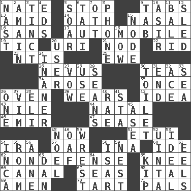 ACROSS 1. Nathan's nickname 5. Obstruct or block passage 9. Bar bills 13. Among 14. Pledge 15. Relating to the nose 16. Without 17. Car 19. Nervous spasm 20. RI univ. 21. Dreamland 22. To free from 23. Nuclear Threat Initiatives 25. She-sheep 26. Congenital growth or mark on the skin 30. Beverages made from leaves 34. Came up 35. At one time in the past 36. Baking chamber 39. Puts on (as clothing) 42. The content of cognition 43. Mediterranean tributary 44. Brizilian seaport 46. Arab leader 47. Gospel singer Marvin 48. Immediately 51. Needle holder 54. Lyricist Gershwin 57. Boat paddle 58. _ tizzy (2 wds.) 60. Binary compound 62. Unrelated to defense, as in spending 65. Leg joint 66. Lessep's creation 67. Oceans 68. Slanted text style (abbr.) 69. So be it 70. Small pie 71. Friends DOWN 1. Political cartoonist Thomas 2. At full speed 3. Colored lightly or faintly 4. Begley and Asner 5. Fly high 6. "Change" in Tahitian 7. Baseball player Mel 8. Give a jingle 9. Bar bill 10. SW Saudi Arabia district 11. Indonesian resort city 12. Downhill vehicle 15. Connecting point 18. Cut the grass 20. One who uses or employs something 24. Sillier 27. Promise 28. Purpose 29. Actors Connery and Penn 30. Bathroom plumbing fixture 31. Conclusion 32. Adept person 33. Ocean 36. Single 37. Zeal 38. Biblical high priest 40. Actress Charlotte 41. R.R. building 45. Toward the sea 48. Christmas carol 49. Clumsy lout 50. Obtain by seizing forcibly or violently 52. National forest in Provo, Utah 53. Standard of perfection 54. South American Indian 55. Wander aimlessly 56. Queen of England 1702-14 58. Austrian river, tributary to the Danube 59. Egg locale 61. Snakelike fish 63. One of the 12 tribes of Israel 64. Teachers' org. 65. Sleep