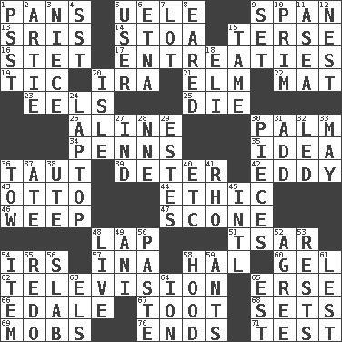 ACROSS 1. Baking dishes 5. Ubangi River tributary 9. Connect, as a bridge 13. Indian titles of respect 14. Portico 15. Laconic 16. Proofreading order 17. Pleas 19. Nervous spasm 20. Retirement account (abbr.) 21. Shade tree 22. Floor covering 23. Snakelike fish 25. Expire 26. Place in a line 30. Inside of hand 34. Actor Sean's family 35. The content of cognition 36. Strained 39. Prevent from occurring 42. Whirlpool 43. Von Bismarck 44. Value system 46. Shed a tear 47. Biscuitlike quick bread 48. Infant locale 51. Russian ruler of old 54. Big collection agency 57. _ tizzy (2 wds.) 58. Actor Linden 60. Set 62. Boob tube 65. Celtic language 66. Peak District village in England 67. A blast of a horn 68. Arranges properly for use 69. Disorderly crowds 70. Extremities 71. Trial DOWN 1. Inconspicuous attention getter 2. Nick name for Arthur 3. Sibling's daughter 4. Fast jet (abbr.) 5. One who uses or employs something 6. Inactive volcano in Sicily 7. Car dealer's back yard 8. Having ears or earlike features 9. Put into a specified state 10. Demure 11. Toward the sea 12. Egg locale 15. Not wild 18. Biblical high priest 20. Capri or Wight 24. Portable computer 27. Working for oneself (abbr.) 28. Compass dir. 29. _____ Park, CO 30. Components 31. Increase 32. Directed 33. Can I? 36. Pull behind 37. Had dinner 38. Shoshoni 40. And so on (abbr.) 41. 17th letter of the Greek alphabet 45. International (abbr.) 48. Moving, as bait 49. Cuckoo 50. Thick mixture 52. Match 53. Musical pauses 54. Detail 55. Make new 56. Broad, flat, thick piece 58. Parka part 59. Pismires 61. For fear that 63. Raised railways 64. Electrically charged atom 65. Eastern Standard Time (abbr.)