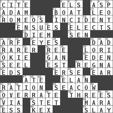 ACROSS 1. Quote 5. Raised railways 8. Viper 11. First man 12. Water vessel 13. Lion 14. Lover boys 17. Happening 19. Takes place subsequently 21. Opts 22. South Vietnam president (1954) 23. Elected rep. 24. Sandy's bark 27. Sight organs 29. Male parent 32. Less widely known 34. Portuguese money of account (variant) 36. Australian parrot (variant) 37. Migrant worker of the '30s 38. Separate the seeds from cotton 39. Paradise 40. Stitch closed the eyes of (a falcon) 41. Eastern Standard Time (abbr.) 42. Rain (Swedish) 43. Begley and Asner 44. Celtic language 46. Hearing organ 47. Had dinner 50. Flair 52. Food allowance for one day 55. Manatee 57. Make much ado about nothing 59. Triplets 62. By way of 63. Proofreading order 64. Hindu Mythology: god of death 65. Curvy letter 66. Dry husk or covering 67. Kill DOWN 1. 4-wheeled motor vehicle 2. Wedding promise 3. Not wild 4. Make improvements or corrections to 5. Period of immesurable duration 6. Shoestrings 7. Vertical member of a panel or frame 8. Actor Baldwin 9. Transmitted 10. Cooking vessels 12. Twice 15. Flexible twig of a willow tree 16. Chop _ 18. Lair 20. Develop 24. Came up 25. Moved through 26. Strips of potato fried in deep fat 28. Gospel singer Marvin 29. Evade 30. Sports stadium 31. Middle Eastern gold or silver currency 33. Snakelike fish 35. Main course 36. Area sheltered from the wind 42. Arrive at 45. Narrow board 47. Wind 48. Cod relative 49. Maternal 51. Typical standards 52. Be footloose 53. Deliberation 54. Afternoon social gatherings 55. Arrange properly for use 56. Welt 58. John Ritter's dad 60. Epoch 61. Declare