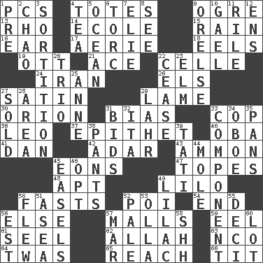 ACROSS 1. Personal Computers (abbr.) 4. Lugs 9. Legendary monster 13. 17th letter of the Greek alphabet 14. Learning spot: Fr. 15. Precipitation 16. Ewer handle 17. Nest on high 18. Snakelike fish 19. Baseball player Mel 21. Adept person 22. Cell (Danish) 24. SW Asia republic 26. Raised railways 27. Smooth fabric 29. Unable to walk 30. Constellation of myth 31. Prejudice 33. Police officer (slang) 36. Lion 37. Curse 40. Chief or king in Benin or Nigeria 41. One of the 12 tribes of Israel 42. The sixth month of the Jewish calendar 43. ID or VA city 45. Immeasurably long periods of time 47. Drinks excessively 48. Fitting 49. _ and Stitch 50. Goes without food and/or water 52. Luau course 54. Conclusion 56. Otherwise 57. Shopping centers 59. Snakelike fish 61. Sew up the eyelids of hawks and falcons 62. Assad's deity 63. Non-commissioned officer (abbr.) 64. It was, poetically 65. Arrive at 66. Teat (slang) DOWN 1. Before (prefix) 2. US Secretary of Labor Elaine L. _ 3. Determination 4. Afternoon social gathering 5. Sea 6. Torque (variant) 7. Writer Wiesel 8. Perceive with the eye 9. Threatening words 10. Highlander 11. Cause heat under the collar 12. Followers of ems 20. Musical group of three 22. Desist 23. Shade tree 25. Queen of England 1702-14 27. Disposed of to a purchaser 28. Type of rug 29. Cowardly lion portrayer 31. Auction offers 32. Call ___ day 33. Piece 34. Mitch Miller's instrument 35. Baking dishes 38. Leg coverings 39. Jacques of French films 44. Undercover agent 45. Artist's stands 46. Choose 49. Pale purple color 50. Soared 51. Toward the sea 52. Diluted with white 53. Rounded earthenware pot or jar 55. Tenth: prefix 56. Eastern Standard Time (abbr.) 57. Third mo. 58. Quiet! 60. Car dealer's back yard