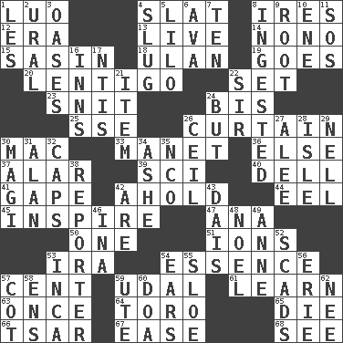 ACROSS 1. Nilotic language 4. Narrow board 8. Angers 12. Period 13. Not recorded 14. Words to Nanette 15. Indian antelope 18. Uhlan (variant) 19. Moves 20. Small, flat, pigmented spot on the skin 22. Put into a specified state 23. In a ____ (agitated or irritated) 24. Again 25. Compass dir. 26. Window treatment 30. Apple computer (short form) 33. French painter Edouard 36. Otherwise 37. Having or resembling wings 39. _-fi 40. Small valley 41. Yawn 42. Hold, grip (Informal) 44. Snakelike fish 45. Stimulate to action 47. Santa ___, CA 50. Single 51. Charged particles 53. Lyricist Gershwin 54. Gist 57. Penny 59. Freehold land 61. Memorize 63. At one time in the past 64. "Corrida" creature 65. Expire 66. Russian ruler of old 67. Comfort 68. Observe DOWN 1. French article 2. Mountain range 3. Fertile tracts in a desert 4. Strike heavily 5. _ and Stitch 6. Actress Gardner 7. "___ Little Indians" 8. Swallowed 9. Carrot, for example 10. Compass dir. 11. Mayday 16. Taverns 17. Nuclear Threat Initiatives 21. A whole individual unit 22. Title for a knight 24. With the exception that 26. To provide with a ceiling 27. Toward shelter 28. Capri or Wight 29. 1994 drama film starring Jodie Foster 30. Wise men 31. Actor Alda or Thicke 32. Smile enhancers 34. American tennis player Robert 35. Non-commissioned officer (abbr.) 38. News announcer 42. "We ___ not amused" (Victoria) 43. Raised platform 46. _ tizzy (2 wds.) 48. Christmas carol 49. Singer Murray 52. Tons 53. South American Indian 54. Hearing organs 55. A type of plum 56. 4th largest of the Great Lakes 57. Small bed 58. Followers of ems 59. Shoshoni 60. ___ good deed 62. Born
