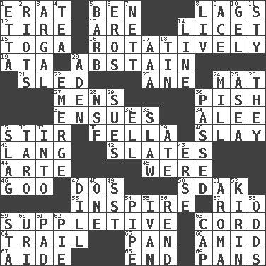 ACROSS 1. Part of Q.E.F. 5. Benjamin's nick name 8. Fails to keep up a pace 12. Become fatigued 13. "We ___ not amused" (Victoria) 14. It is permitted: Lat. 15. Ancient Roman robe 16. Producing rotation 19. "One Day ___ Time" 20. Choose not to consume 21. Downhill vehicle 23. One (Scot) 24. Floor covering 27. Not women's 30. Expression of disdain 31. Follows as a consequence or result 34. Toward shelter 35. Move through with a circular motion 38. Chap (slang) 40. Kill 41. Long (Scottish) 42. Chalkboards 44. Johnson of "Laugh-In" 45. Past tense of be (plural) 46. Thick or sticky substance 47. Two (Sp.) 50. Neighbor of Neb. 53. Heighten or intensify 57. River (Sp.) 59. Supplying deficiencies 63. Drawstring 64. Lag or linger behind 65. Baking dish 66. Among 67. Assistant 68. Conclusion 69. Baking dishes DOWN 1. Singer James 2. Debaucheries 3. Therefore, facetiously 4. Afternoon social gathering 5. Sharp remark 6. Greek god of love 7. Remaining after all deductions 8. 54 in ancient Rome 9. Adept person 10. Set 11. Filthy place 14. Actor's bit 17. American Automobile Association (abbr.) 18. Metal container 20. An important port of Yemen 22. Develop 24. Place where flour is made 25. At sea 26. Those people 28. Science/research agcy. 29. Takes to court 30. Went by 32. Pipe bend 33. Cole _ (cabbage dish) 35. Volcanic refuse 36. Edible starchy tuberous root 37. To the inside or interior of 39. Had dinner 43. Celtic language 47. Deli pickle 48. Single 49. Fast jet (abbr.) 51. Odor 52. Japanese brewing company 54. Corncob 55. "Terrible" tsar 56. Tear apart 58. Probability 59. R.R. building 60. RI univ. 61. Writing tablet 62. Sliced dessert 63. Head covering