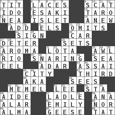 ACROSS 1. Teat (slang) 4. Shoestrings 9. Leave at once 13. Wedding promise 14. 1973 Nobel Price Winner (Physics) Leo 15. Edible starchy tuberous root 16. Teachers' org. 17. Small island 18. Afresh 19. Find the sum of 21. Raised railways 22. Leaves out 24. Omen 26. 4-wheeled motor vehicle 27. Prevent from occurring 29. Puts into a specified state 30. Odor 31. Globular water bottle used in Asia 33. Leather borer 36. _ de Janeiro 37. Catching in a trap 40. Ocean 41. Snakelike fish 42. The sixth month of the Jewish calendar 43. Slender Brazilian palm 45. Municipality 47. One of three equal parts 48. Alias (abbr.) 49. Perceives with the eye 50. Klaipeda city 52. Area sheltered from the wind 54. R.R. building 56. Assistant 57. Dipping utensil 59. Santa ___, CA 61. Having or resembling wings 62. Poet Dickinson 63. And not 64. _ mater 65. Honkers 66. Make lace DOWN 1. Metal container 2. The content of cognition 3. Inedible or poisonous agaric 4. Luau accessory 5. NE Netherlands city 6. Give a ring to 7. Supplements with great effort 8. Be seated 9. Flight of steps 10. Patter 11. Ancient Greek god of war 12. Pull behind 20. South Vietnam president (1954) 22. Sea 23. Floor protector 25. Pate de foie ____ 27. Have the gumption 28. 4th largest of the Great Lakes 29. Disorderly outburst 31. Kenny Rogers chart-topper in '80 32. Mouth or opening 33. Helper 34. Erode 35. Put down 38. Relating to or accompanying birth 39. Yard entry 44. "______ My Girl" (Turtles hit) 45. Device for capturing images 46. D.D.E's nickname 49. Exchanges for money 50. Place where flour is made 51. Dutch treat 52. Unable to walk 53. Singer Brickell 55. Small Philippine buffalo 56. Auto club (abbr.) 57. Part of a journey 58. Sight organ 60. Nonscientific branch of learning