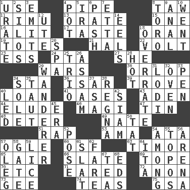 ACROSS 1. Purpose 4. Corncob 8. The 23rd letter of the Hebrew alphabet 11. Tall New Zealand timber tree 13. Speak pompously 15. Single 16. Set down 17. Clothes sense 18. Northwest Algerian city 19. Lugs 21. Actor Linden 22. Electrical Unit 23. Double-curved letter 24. Parent Teacher Association (abbr.) 27. A female animal or person 29. Armed conflicts 30. Lowest deck of a ship 34. R.R. building 36. Austrian river, tributary to the Danube 39. Collection of objects 40. Grant temporary use of 41. Fertile tracts in a desert 43. An important port of Yemen 44. Dodge 46. Wise men 47. Shallow baking pan 48. Prevent from occurring 49. Nathan's nickname 51. Reproach for some lapse or misdeed 53. Wet nurse (var.) 54. "One Day ___ Time" 57. Stare 60. Order of Saint Francis (abbr.) 63. The easternmost of the Lesser Sundas 65. Den 66. Schedule 69. Drink excessively 70. And so on (abbr.) 71. Having ears or earlike features 72. Soon (poet.) 73. Unit of force equal to gravity 74. Afternoon social gatherings 75. Girls' org. (abbr.) DOWN 1. A salt of uric acid 2. Grain storage towers 3. Gives off 4. Cooking vessel 5. Retirement account (abbr.) 6. Romantic infatuation 7. Singer James 8. "Corrida" creature 9. Of or related to the anus 10. Left 12. Shoshoni 14. Snakelike fish 18. Make much ado about nothing 20. Health resort 25. Musical group of three 26. Indian state 28. Being at a high temperature 29. Roamer 31. Farming town in central California 32. Baking chamber 33. Writing instrument 34. Not divided or shared with others 35. Drawn tight 37. White ___ sheet 38. Canadian anthropologist Darnell 40. Directed 42. Thailand, formerly 45. Epoch 50. Make lace 52. Introduce or present, as a question 54. Amid 55. Traditional theme or motif 56. Sports stadium 57. Cassini of fashion 58. Yard entry 59. Louse (plural) 61. Narrow board 62. Conductor's collection 64. Call ___ day 67. Beverage made from leaves 68. Begley and Asner