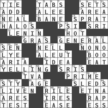 ACROSS 1. Neckwear 4. Bar bills 8. Arranges properly for use 12. Increase 13. Toward shelter 14. Type of rug 15. Actress Patricia 17. Object of repulsion 18. Small fatty European fish 19. Auras 21. Air pressure measure (abbr.) 23. _ Lanka 24. Soviet premier 1918-24 26. Being at a high temperature 28. Pate de foie ____ 30. Commissioned military rank 34. Elected rep. 37. 1994 drama film starring Jodie Foster 39. Words to Nanette 40. Sodium hydroxide 41. Native American of Southwest Alaska 43. Sometimes accompanies a hiss 44. Operatic vocal solo 46. The content of cognition 47. Erode 48. Crying or shouting loudly 51. Indian titles of respect 54. Federal power corp. 55. A-one 58. Filthy place 61. Grow older 63. Bobsleighs 65. Make or become more lively 67. Cause heat under the collar 71. Inactive volcano in Sicily 72. Ancient Greek god of war 73. Angers 74. Reproach for some lapse or misdeed 75. Trial 76. Comfort 77. Double-curved letter DOWN 1. Hyperbolic tangent 2. Standard of perfection 3. Peak District village in England 4. Keyboard key 5. In the manner of 6. Benjamin's nick name 7. Ooze 8. Plant excrement 9. Blunders 10. Pull into pieces 11. Suttee (variant) 16. Protracted 18. The Jewish people; Israel 20. Title for a knight 22. A female animal or person 25. Grandmother 27. Nine, plus one 29. Former Milwaukee Brewers owner Bud 30. Cements 31. Loose flowing garment 32. Small Philippine buffalo 33. Spoils 34. Kill 35. Jane of fiction 36. Famous astronaut Armstrong 38. Directed 42. Canvas cover 45. Keyboard modifier key 49. _ the terrible 50. Tired old horse 52. Big collection agency 53. Filth; sediment 56. Distance measurement (Brit.) 57. Ferber et al. 58. Narrow board 59. Become fatigued 60. Jacques Cousteau's middle name 62. 4th largest of the Great Lakes 64. Plant excrements 66. Eastern Standard Time (abbr.) 68. Lyricist Gershwin 69. French article 70. Compass dir.