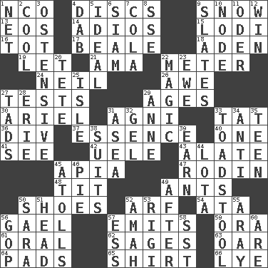 ACROSS 1. Non-commissioned officer (abbr.) 4. Plates 9. Overwhelm 13. Greek goddess of the dawn 14. Goodbye (Sp.) 15. Farming town in central California 16. Small child 17. Calif. Air Force Base 18. Arabian gulf 19. Allow 21. Housemaid (var.) 22. Distance measurement 24. Famous astronaut Armstrong 26. Deep reverence 27. Trials 29. Eons 30. Satellite of Uranus 31. Hindu god of fire 33. Make lace 36. HTML Container Element 37. Center 40. Single 41. Perceive with the eye 42. Ubangi River tributary 43. Having winglike extensions 45. Capital of Western Samoa 47. "The Thinker" sculptor 48. Teat (slang) 49. Pismires 50. Imelda's hoard 52. Sandy's bark 54. _ moment's notice (2 wds.) 56. Highlander 57. Sends forth 59. Mouth or opening 61. Spoken 62. Gurus 63. Boat paddle 64. Writing tablets 65. Chest covering 66. Sodium hydroxide DOWN 1. Fish or hair follower 2. Calm and collected 3. Clearly or manifestly demonstrative 4. Small moist lump or mass 5. Perfect 6. Thailand, formerly 7. Root beer relative 8. Compass dir. 9. Chalkboards 10. Connecting point 11. River in Europe 12. Victory 20. False hair 22. Mysterious quality of enchantment 23. She-sheep 25. Small island 27. Small amounts or degrees 28. One of the Great Lakes 29. Singer Murray 31. At sea 32. Set 33. Inedible or poisonous agaric 34. Opposed to 35. Adolescent 38. Sets of matching outer garments 39. Merit 44. Globular water bottle used in Asia 45. Ringlike coral islands and reefs 46. Sliced dessert 49. Following 50. "Two Mules for Sister ____" 51. Froth on beer 52. Nanny 53. Swiss mountan, "Queen of the Mountains" 55. Like ___ of sunshine 56. Republican Party 57. Double-curved letter 58. Fast jet (abbr.) 60. "We ___ not amused" (Victoria)