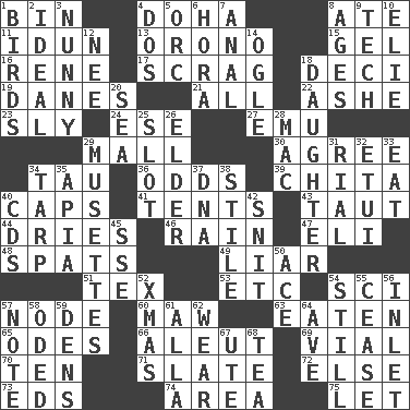 ACROSS 1. Storage container 4. Capital of the state of Qatar 8. Had dinner 11. Goddess of spring and wife of Bragi 13. U. of Maine site 15. Set 16. French philosopher Descartes 17. Lean end of the neck 18. Tenth: prefix 19. Natives or inhabitants of Denmark 21. Everything 22. American tennis player Robert 23. Secret 24. Compass dir. 27. Australian flightless bird 29. Promenade 30. Match 34. The 19th letter of the Greek alphabet 36. Likelihood 39. Riviera of "Kiss of the Spider Woman" 40. Balmoral and tarboosh 41. Portable shelters 43. Pulled tight 44. Frees from moisture 46. Water falling in drops from the sky 47. Connecticut Ivy Leaguer 48. Arguments over trivial matters 49. One who doesn't tell the truth 51. John Ritter's dad 53. And so on (abbr.) 54. _-fi 57. Thickened enlargement 60. Informal term for the mouth 63. Ingested 65. Lyric poems 66. Native American of Southwest Alaska 69. Small bottle 70. "___ Little Indians" 71. Schedule 72. Otherwise 73. Begley and Asner 74. Length times width 75. Allow DOWN 1. Avian creatures 2. Perfect 3. Pet term 4. Two (Sp.) 5. The grampus (Milton) 6. Israeli folk dance 7. Of or related to the anus 8. Matures 9. Technical work 10. Writer Wiesel 12. Born 14. Stare 18. Female offspring 20. Ocean 25. Narrow, elongated depression 26. A person who is older than you are 28. Big _ 29. French bagpipes 31. Monetary unit of Yemen 32. Needle case 33. Consume 34. Canvas cover 35. Capital of Western Samoa 37. Heredity factor (abbr.) 38. Vertical member of a panel or frame 40. Music discs 42. In a ____ (agitated or irritated) 45. Compass dir. 50. Adept person 52. Dec. holiday 54. Not moving 55. Desist 56. An arm off of a larger body of water 57. Musical sound 58. Wrote a lyric poem 59. Habitations of wild animals 61. Silent film actress Nazimova 62. Put on (as clothing) 64. "___ Maria" 67. Shoshoni 68. Afternoon social gathering