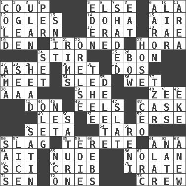 ACROSS 1. Clever action or accomplishment 5. Otherwise 9. According to 12. Stares 14. Capital of the state of Qatar 15. Atmosphere 16. Acquire or gain knowledge or skills 17. Part of Q.E.F. 18. Actress Charlotte 19. Lair 20. Pressed 23. Israeli folk dance 24. Use a spoon 25. Inky black, to poets 27. American tennis player Robert 30. Was introduced to 32. Two (Sp.) 33. Rendezvous 34. Downhill vehicle 36. Soggy 38. Auto club (abbr.) 39. A female animal or person 40. Last letter of the English alphabet 43. Spanish title 46. Snakelike fish 48. Keg 49. French article 51. Snakelike fish 52. Celtic language 53. Stalk of a moss capsule 54. Pacific island yam 56. Volcanic refuse 58. Cigar-shaped 61. Santa ___, CA 64. Small island 65. Naked 66. Pitcher Ryan 68. _-fi 69. Baby bed with high sides 70. Feeling or showing extreme anger 71. Elected rep. 72. Singles 73. Group working together DOWN 1. Chilled 2. Double curve, resembling the letter S 3. ____ Bator 4. For each 5. Locale of original sin 6. Old wives' tales, e.g. 7. Cast a shadow over 8. Consume 9. Composer Copland 10. One who doesn't tell the truth 11. Type of rug 13. In a ____ (agitated or irritated) 21. Basketball hoops 22. Threatening words 23. Stockings 24. Arrange properly for use 26. Arrow shooter 27. Housemaid (var.) 28. Ocean 29. Froth on beer 31. Giggle 35. Keyboard key 37. Russian ruler 41. Double-curved letter 42. Make supply last 44. Cassini of fashion 45. Fish or hair follower 47. Narrow board 48. Corporate head (abbr.) 50. Titan orbits this 53. Smooth fabric 55. Painter Guido (1575-1642) 56. Backtalk 57. Louse (plural) 59. Singer Brickell 60. Confederate soldiers (slang) 61. Having or resembling wings 62. Nathan's nickname 63. Afresh 65. Non-commissioned officer (abbr.) 67. The grampus (Milton)