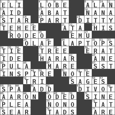 ACROSS 1. Biblical high priest 4. Ear part 8. ____ Jay Lerner 12. Assist 13. Blind as ____ 14. Nanny 15. Play the lead 17. Piece 18. Simple song 19. Giggle 21. _ moment's notice (2 wds.) 23. Part of HMS, perhaps 24. Cowboy competition 26. Australian flightless bird 28. Norwegian king 30. Portable computers 34. Neckwear 37. Woody plant 39. Part of Q.E.F. 40. Binary compound 41. Ethiopian city, capital of Harari 43. A saturated hydrocarbon 44. Monetary unit of Botswana 46. Female horse 47. Fast jet (abbr.) 48. Stimulate to action 51. Make mention of 54. Three (prefix) 55. Gurus 58. Health resort 61. Say or write further 63. A piece of turf (Scot.) 65. Composer Copland 67. Wrote a lyric poem 71. Trig term 72. Entreaty 73. Words to Nanette 74. Make lace 75. Shrivel 76. Small boys 77. "We ___ not amused" (Victoria) DOWN 1. Compass direction 2. 61 cubic inches 3. Potato state 4. Pet locale 5. Chief or king in Benin or Nigeria 6. Soap unit 7. Singer James 8. Cuckoo 9. Thin strip of wood or metal 10. Against 11. Negative votes 16. Redecorate 18. Moist 20. Snakelike fish 22. Beverage made from leaves 25. Pledge 27. Shoshoni 29. Movie unit 30. Acquire or gain knowledge or skills 31. Mouths or openings 32. Baking dishes 33. Proofreading order 34. Native american tent (variation) 35. Goddess of spring and wife of Bragi 36. Snakelike fish 38. Epoch 42. Vintage cars 45. Fitting 49. SW Asia republic 50. To free from 52. Bit 53. Armor plate that protects the chest 56. Webber/Rice musical 57. Underwater navigation system 58. Plant excrements 59. Light colored 60. Length times width 62. Do not 64. False hair 66. Rowing implement 68. ___ good deed 69. Conclude 70. Two (Sp.)