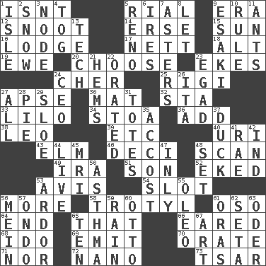 ACROSS 1. Is not 5. Monetary unit of Yemen 9. Epoch 12. Snout, nose 14. Celtic language 15. Player for Phoenix 16. Inn 17. Remaining after all deductions 18. The first octave above the treble staff 19. She-sheep 20. Opt 23. Makes supply last 24. "Mermaids" star 25. Swiss mountan, "Queen of the Mountains" 27. Domed church section 30. Floor covering 32. R.R. building 33. _ and Stitch 34. Portico 36. Increase 38. Lion 39. And so on (abbr.) 40. RI univ. 43. Shade tree 46. Tenth: prefix 48. Skim 49. Lyricist Gershwin 51. Boy, to dad 52. Made supply last 53. Advice 54. Position in a hierarchy or organization 56. Greater amount 58. TNT 61. Bear (Spanish) 64. Conclusion 65. Not this but _ 66. Having ears or earlike features 68. Wedding promise 69. Send forth 70. Speak pompously 71. Not either 72. Billionth: prefix 73. Russian ruler of old DOWN 1. Small island 2. Overwhelm 3. Thickened enlargement 4. Coat; cloak 5. Western Nevada city 6. Angers 7. Michaelmas daisies 8. Allow 9. 1973 Nobel Price Winner (Physics) Leo 10. Governing power 11. Pismires 13. Technology 21. Cloth borders 22. Spoke pompously 23. Mild oath 24. Corporate head (abbr.) 26. Call ___ day 27. Everything 28. Sliced dessert 29. A type of plum 31. Hauls 35. Buttonhole 37. Evade 41. Actress Charlotte 42. Working for oneself (abbr.) 44. Moving, as bait 45. Medical imaging device (abbr.) 47. Inwardly 48. Arrange properly for use 50. Respiratory problem 53. Zeal 55. Margarine 56. Chow _ 57. Southwest Nigerian state 59. Precipitation 60. Von Bismarck 61. Mouths or openings 62. Bristle 63. River in Europe 65. "___ Little Indians" 67. Nonscientific branch of learning