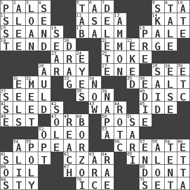 ACROSS 1. Friends 5. Bit 8. R.R. building 11. A type of plum 12. Toward the sea 14. Krazy ___ of comics 15. Seines 17. Lip ointment 18. Light colored 19. Watched over 21. Develop 23. "We ___ not amused" (Victoria) 25. Puff or smoke 26. Like ___ of sunshine 27. Compass dir. 28. Perceive with the eye 31. Australian flightless bird 33. Commissioned mil. rank 35. Started a card game 37. Stitch closed the eyes of (a falcon) 38. Male child 40. Plate 41. Bobsleighs 43. Armed conflict 45. Binary compound 46. Eastern Standard Time (abbr.) 47. Globe 50. Airs 52. Margarine 53. "One Day ___ Time" 54. Seem 56. Make 61. Slit 62. Russian ruler of old 65. An arm off of a larger body of water 66. Petroleum 67. Israeli folk dance 68. Do not 69. Filthy place 70. Frozen water 71. Bristle DOWN 1. Inconspicuous attention getter 2. Toward shelter 3. Grant temporary use of 4. Post 5. Keyboard key 6. White ___ sheet 7. Keyboard key 8. Heroin 9. Falsehood 10. Had dinner 13. ID or VA city 16. Wither 18. Before (prefix) 20. To trail on the ground 22. Supplemented with great effort 24. Snake ____ (dice throw) 26. Old (Scot.) 28. Expressed in words 29. Otherwise 30. And so on (abbr.) 31. Snakelike fish 32. Rendezvous 34. At this time 36. Singer Brickell 37. Compass dir. 39. California wine valley 42. Flatfish 44. College mil. group 48. Arrive at 49. Russian wolfhound 51. Indian skirt 52. Choose 54. Came down and settled, as after flight 55. Much (prefix) 57. Conclusions 58. _ vera 59. Portable shelter 60. Singer James 61. Distress signal 63. Curve 64. Actress Charlotte