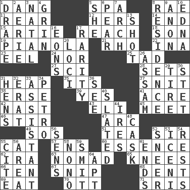 ACROSS 1. Mild oath, euphamism for damn 5. Health resort 8. Actress Charlotte 11. Tail end 12. Possessive pronoun 14. Conclusion 15. Nick name for Arthur 17. Arrive at 18. Boy, to dad 19. Player piano 21. 17th letter of the Greek alphabet 22. _ tizzy (2 wds.) 23. Snakelike fish 24. Or not 25. Small amount or degree 27. _-fi 28. Puts into a specified state 31. Pile 35. ___ a Wonderful Life 37. In a ____ (agitated or irritated) 38. Celtic language 39. Affirmative reply 41. Land measure 42. Political cartoonist Thomas 43. Connecticut Ivy Leaguer 45. Confront 46. Commotion 47. Curve 49. Mayday 51. Afternoon social gathering 52. Title for a knight 55. Feline 57. Followers of ems 60. Gist 62. Retirement account (abbr.) 63. Roamer 65. Leg joints 66. Nine, plus one 67. Clip 68. Incision 69. Erode 70. Baseball player Mel 71. Indian titles of respect DOWN 1. Window treatment 2. Nest on high 3. Relating to or accompanying birth 4. Broad smile 5. A female animal or person 6. Lightbulb-shaped fruit 7. Bowlike part 8. Home 9. At once, immediately (arch.) 10. Pulitzer Prize-winning author Ferber 13. Guess 16. Immeasurably long periods of time 17. Noteworthy scarcity 20. Event scenes 26. Indian state 29. Become fatigued 30. Proofreading order 31. Coop moms 32. Part of Q.E.F. 33. Aide 34. Stone: prefix 36. Perceive with the eye 40. Scheduled 44. Angers 48. Keg 50. Elected reps. 52. Contemptuous expression 53. Ancient Celtic tribe of eastern Britain 54. Musical pauses 55. Quote 56. Type of rug 58. Words to Nanette 59. Stricken, poetically 61. Extremities 64. Fitting