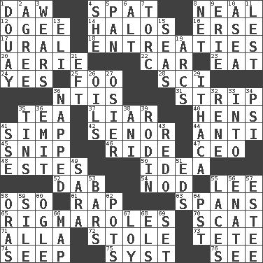 ACROSS 1. Simpleton 4. Argument over a trivial matter 8. Be tempered by heat 12. Double curve, resembling the letter S 14. Auras 16. Celtic language 17. Mountain range 18. Pleas 20. Nest on high 22. Auto 23. Ingest 24. It is so 25. Egg _ yung 28. _-fi 30. Nuclear Threat Initiatives 31. Remove all contents or possession from 35. Afternoon social gathering 37. One who doesn't tell the truth 40. Coop moms 41. Simple or foolish person 42. Sir (Sp.) 44. Against 45. Clip 46. Travel on or in a vehicle 47. Corporate head (abbr.) 48. _____ Park, CO 50. The content of cognition 52. Apply (a substance) by light strokes 54. Allow head to fall sleepily 55. Area sheltered from the wind 58. Bear (Spanish) 61. Strike 63. Connects, as a bridge 65. Complicated, petty procedures 70. Get outta here! 71. Silent film actress Nazimova 72. Took without asking 73. Wig 74. Ooze 75. System (abbr.) 76. Observe DOWN 1. A city in N France, SE of Calais 2. Match 3. Puts on (as clothing) 4. A female animal or person 5. Baking dish 6. The first octave above the treble staff 7. Torque (variant) 8. Fish or hair follower 9. 4th largest of the Great Lakes 10. At sea 11. For fear that 13. Biblical high priest 15. Oceans 19. Arches 21. Newt 26. Lubricates 27. Flexible twig of a willow tree 29. New York city 30. Slept 32. French philosopher Descartes 33. To the inside or interior of 34. 23rd letter of the Greek alphabet 35. Metal containers 36. Give off 38. Cuckoo 39. "The Thinker" sculptor 41. Compass dir. 43. Do over again 49. "Two Mules for Sister ____" 51. Begley and Asner 53. Oblong pieces of solid material 55. Shoestrings 56. Related on the mother's side 57. First name in cosmetics 58. Mouths or openings 59. Drop; flow; fall 60. Stare 62. Plant holders 64. Pacific Standard Time (abbr.) 66. Atlas unit 67. Myrna of the movies 68. Raised railways 69. Arrange properly for use