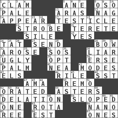 ACROSS 1. Burrowing marine mollusk 5. A saturated hydrocarbon 8. Bear (Spanish) 11. Diluted with white 12. Caspian sea tributary 13. Tired old horse 14. Become visible 17. A testis 19. Disco prop 21. Cylindrical with tapered ends 22. Filth; sediment 23. Consenting reply 24. Make lace 27. Transmit 29. Arrow shooter 32. Came up 34. Distress signal 36. One who doesn't tell the truth 37. Repulsive 38. Elect 39. Celtic language 40. Inside of hand 41. Teachers' org. 42. Methods 43. Raised railways 44. Cause heat under the collar 46. Fast jet (abbr.) 47. Wet nurse (var.) 50. San ____ (Riviera town) 52. Declaimed 55. Michaelmas daisies 57. Accusation by an informer 59. Had an oblique or slanted direction 62. Single 63. Round or rotation of duties 64. Billionth: prefix 65. To riddle 66. Eastern Standard Time (abbr.) 67. Singles DOWN 1. Numbers guy (abbr.) 2. Infant locale 3. High mountains 4. Confronts 5. "We ___ not amused" (Victoria) 6. Difficult 7. First name in cosmetics 8. Single time 9. Table seasoning 10. Double curve, resembling the letter S 12. Had dinner 15. Get up 16. Hero or heavy, e.g. 18. Big collection agency 20. Gillaume's butler role 24. Grayish beige 25. Therefore, facetiously 26. For Whom the Bell _____ 28. Drug addict 29. Avian creatures 30. Fertile tracts in a desert 31. Obtain by seizing forcibly or violently 33. Symbol (abbr.) 35. Flight of steps 36. Lion 42. Klaipeda city 45. Allows 47. "One Day ___ Time" 48. Distance measurement (Brit.) 49. Goodbye (Sp.) 51. U. of Maine site 52. Scent 53. French philosopher Descartes 54. Toward shelter 55. Santa ___, CA 56. Connect, as a bridge 58. Baseball player Mel 60. Compass dir. 61. Two (Sp.)