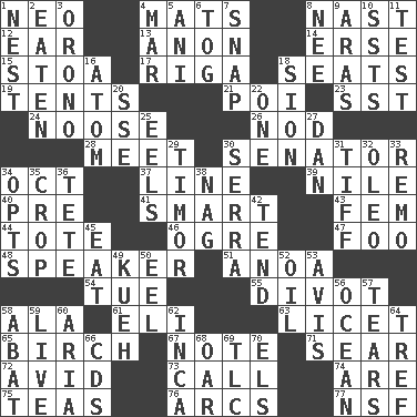 ACROSS 1. Modern: prefix 4. Floor protectors 8. Political cartoonist Thomas 12. Ewer handle 13. Soon (poet.) 14. Celtic language 15. Portico 17. Capital of Latvia 18. Theater features 19. Portable shelters 21. Luau course 23. Fast jet (abbr.) 24. Trap for birds or small mammals 26. Dreamland 28. Rendezvous 30. Elected representative 34. Sep. follower 37. Actor's bit 39. "Death on the ____" 40. Before (prefix) 41. Don Adams' spy role 43. Opposite of masc. 44. Lug 46. Legendary monster 47. Egg _ yung 48. Orator 51. Small Philippine buffalo 54. Third day of the wk. 55. A piece of turf (Scot.) 58. Wing 61. Connecticut Ivy Leaguer 63. It is permitted: Lat. 65. A tree used for making furniture 67. Observe 71. Dry up 72. Enthusiastic 73. Give a ring to 74. "We ___ not amused" (Victoria) 75. Afternoon social gatherings 76. Curves 77. Overdraft (abbr.) DOWN 1. A home for chicks 2. Ingested 3. U. of Maine site 4. Third mo. 5. Cuckoo 6. Coat; cloak 7. Fastener 8. Born 9. Ancient river in northeast Turkey 10. Fast planes 11. Trial 16. Smallest unit of an element 18. The Jewish people; Israel 20. Compass dir. 22. Single 25. Snakelike fish 27. One of the 12 tribes of Israel 29. Southeast Indonesia island 30. Father Junipero _ 31. Small quarrel 32. Butter sub 33. San ____ (Riviera town) 34. Elects 35. Riding implement 36. False hair 38. Tired old horse 42. Watch over 45. Consume 49. Malaysian steamed pastry 50. Snakelike fish 52. Petroleum 53. Deliberation 56. Sea 57. Pulls into pieces 58. Blind as ____ 59. Moving, as bait 60. Roberta Peters solo 62. South American Indian 64. Not kosher 66. Music discs 68. Boat paddle 69. Affectionate concern, for short 70. Raised railways