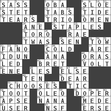 ACROSS 1. Backtalk 5. Chief or king in Benin or Nigeria 8. _ gin 12. Proofreading order 13. Bar bills 15. Event that recurs at intervals 16. Rends 18. Musical group of three 19. Sign of something about to happen 20. One (Scot) 22. Paper fasteners 24. "Corrida" creature 26. Actress Charlotte 27. It was, poetically 28. Elected rep. 29. Pull behind 32. Papal veil 35. Chilled 37. "We ___ not amused" (Victoria) 38. Goddess of spring and wife of Bragi 39. Santa ___, CA 40. Mouths or openings 41. Directed 42. Cy Young winner Saberhagen 43. Electrical Unit 44. Compass dir. 45. French article 46. Otherwise 49. Nine, plus one 50. Letter starter 51. Opts 55. Nervous spasm 56. A blast of a horn 57. Butter sub 59. Drug addict 63. Domed church section 64. Grandmother 65. Ancient Persian 66. One who makes use of a thing 67. Science/research agcy. 68. Celtic language DOWN 1. Fast jet (abbr.) 2. Had dinner 3. Ocean 4. Ski resort town in Vermont 5. Baseball player Mel 6. Taverns 7. "This won't hurt ____!" 8. Took without asking 9. Welles in "The Third Man" 10. Lyric poems 11. Car or cant ending 14. Flew 17. Overwhelm 21. Epoch 23. Baking dish 25. Motion picture awards 28. Scheduled 29. Pacific island yam 30. Spoken 31. Compass direction 32. Do some clerical work 33. Arabian gulf 34. Unadorned 36. Single 40. Conquer 42. Gillaume's butler role 45. Lion 47. Allow 48. Stated 49. Carrier 51. 911 reaches them 52. Stockings 53. Enthusiasm 54. Elected reps. 56. The 19th letter of the Greek alphabet 58. Clumsy lout 60. For each 61. Begley and Asner 62. To riddle