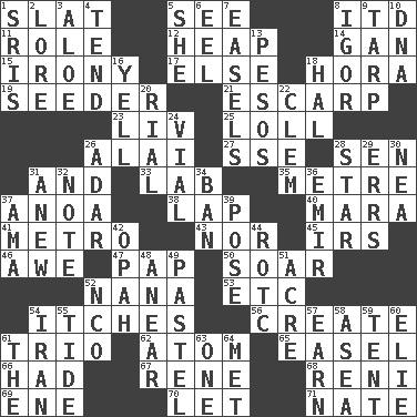 ACROSS 1. Narrow board 5. Observe 8. It would 11. Hero or heavy, e.g. 12. Pile 14. Separate the seeds from cotton 15. Literary sarcasm 17. Otherwise 18. Israeli folk dance 19. Sowing specialist 21. Fortification 23. 54 in ancient Rome 25. Hang loosely or laxly 26. Jai ____ 27. Compass dir. 28. Elected rep. 31. Added to 33. Experiment locale 35. Distance measurement (Brit.) 37. Small Philippine buffalo 38. Pet locale 40. Hindu Mythology: god of death 41. Paris' subway 43. Not either 45. Big collection agency 46. Deep reverence 47. Infant food 50. Fly high 52. Nanny 53. And so on (abbr.) 54. Irritating cutaneous sensations 56. Cause to be 61. Musical group of three 62. Smallest unit of an element 65. Artist's stand 66. Possessed 67. French philosopher Descartes 68. Painter Guido (1575-1642) 69. Compass dir. 70. Allow 71. Nathan's nickname DOWN 1. Indian titles of respect 2. Old wives' tales, e.g. 3. Medicinal plant 4. Be inclined (to) 5. A female animal or person 6. Snakelike fish 7. Artist's stands 8. Composer Stravinsky 9. Canvas cover 10. Heredity factor (abbr.) 13. Mexican monetary units 16. Shout 18. Actor Linden 20. Monetary unit of Yemen 22. To starve (Brit.) 24. Small bottle 26. The sixth month of the Jewish calendar 28. Play the lead 29. Blunders 30. Teachers' org. 31. Afresh 32. Short letter 34. Forbid 36. Independent ruler or chieftain 37. Nanny (var.) 39. Airs 42. Brightly colored fish 44. College mil. group 48. Approach 49. Soft color 51. 1/640 square mile 52. Non-commissioned officer (abbr.) 54. SW Asia republic 55. Periodic rise and fall of the sea level 57. Merit 58. At sea 59. Portable shelter 60. Writer Wiesel 61. Definite Article 63. Single 64. Was introduced to