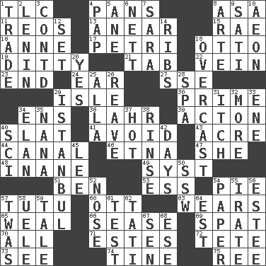 ACROSS 1. Affectionate concern, for short 4. Baking dishes 8. White ___ sheet 11. Vintage cars 13. Approach 15. Actress Charlotte 16. Queen of England 1702-14 17. _ dish (used to culture cells) 18. "Beetle Bailey" pooch 19. Simple song 21. Keyboard key 22. Distinctive style or manner 23. Conclusion 24. Hearing organ 27. Compass dir. 29. Capri or Wight 30. First class 34. Followers of ems 36. Cowardly lion portrayer 39. NE Massachussets city 40. Narrow board 41. Prevent from happening 43. Measure of real estate 44. Lessep's creation 46. Inactive volcano in Sicily 47. A female animal or person 48. Lacking in sense or substance 49. System (abbr.) 51. Benjamin's nick name 53. Double-curved letter 54. Sliced dessert 57. Ballerina skirt 60. Baseball player Mel 63. Puts on (as clothing) 65. Welt 66. Gospel singer Marvin 69. Petty quarrel 70. Everything 71. _____ Park, CO 72. Wig 73. Perceive with the eye 74. Prong on a fork 75. Portuguese money of account (variant) DOWN 1. Swap 2. Soviet premier 1918-24 3. Continued (abbr.) 4. Infant food 5. One (Scot) 6. Remaining after all deductions 7. "Two Mules for Sister ____" 8. Johnson of "Laugh-In" 9. Suttee (variant) 10. A really long time 12. Put into a specified state 14. Teases 18. Cloudy 20. Consenting reply 25. Silent film actress Nazimova 26. Break or tear apart 28. Health resort 29. Byzantium, centuries later 31. Hankering 32. Greater amount 33. Compass dir. 34. Liveliness 35. Nanny 37. Being at a high temperature 38. Wash lightly 40. _-fi 42. 24-hour periods 45. Area sheltered from the wind 50. Compass dir. 52. Characteristic smell of wine 54. Some stationery 55. Feeling or showing extreme anger 56. First name in cosmetics 57. It was, poetically 58. Ubangi River tributary 59. Story 61. Trial 62. Jacques of French films 64. Eastern Standard Time (abbr.) 67. Elected rep. 68. Compass dir.