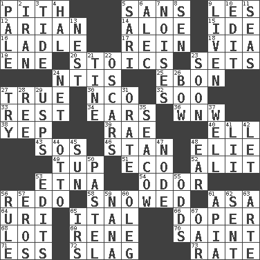 ACROSS 1. Heart or essence 5. Without 9. French article 12. Believer in; advocate of (suffix) 14. _ vera 15. Binary compound 16. Dipping utensil 17. It's straight from the horse's mouth 18. By way of 19. Compass dir. 20. Unemotional ones 23. Arranges properly for use 24. Nuclear Threat Initiatives 25. Inky black, to poets 27. Loyal 30. Non-commissioned officer (abbr.) 32. "Barney Miller" actor Jack 33. Remainder 34. Hearing organs 36. Compass dir. 38. Slangy assent 39. Actress Charlotte 40. Pipe bend 43. Mayday 46. Comedian Laurel of Laurel & Hardy 48. Writer Wiesel 49. Uncastrated adult male sheep 51. Environmental prefix 52. Came down and settled, as after flight 53. Inactive volcano in Sicily 54. Aroma 56. Do over again 58. Frozen precipiation fell 61. White ___ sheet 64. RI univ. 65. Slanted text style (abbr.) 66. Drug addict 68. Car dealer's back yard 69. French philosopher Descartes 70. Virtuous person 71. Curvy letter 72. Volcanic refuse 73. Pace DOWN 1. Light colored 2. SW Asia republic 3. Periodic rise and fall of the sea level 4. Actor Linden 5. Indian skirt 6. Actor Baldwin 7. Annoying sounds 8. Elected rep. 9. Make or become more lively 10. Prepare for publication 11. Oceans 13. Egg locale 21. Prong on a fork 22. Motion picture awards 23. Within a short period 24. Fish or hair follower 26. Arrow shooter 27. Attempt to accomplish something 28. To separate or throw off 29. United States Postal Service (abbr.) 31. Declaim 35. Manatee 37. Not ill 41. Cards in a Roman deck? 42. Allow 44. "Beetle Bailey" pooch 45. Player for Phoenix 47. Thickened enlargement 48. Ewer handle 50. Soft color 53. Proofreads 55. Probability 56. Court order 57. Greek god of love 59. Nanny 60. Cassini of fashion 61. Capital of Western Samoa 62. Transmitted 63. Johnson of "Laugh-In" 65. Big collection agency 67. Boat paddle