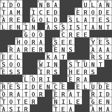 ACROSS 1. Wedding promise 4. Basketball assoc. 7. Uhlan (variant) 11. Scottish cap 12. On the rocks 13. Wear away 14. "We ___ not amused" (Victoria) 15. Aureate 16. Chalkboards 17. Soviet premier 1918-24 19. Aide 21. Thick or sticky substance 23. Algonquian 24. Israeli folk dance 25. Observe 26. It is so 29. Less widely known 30. Followers of ems 31. Auto club (abbr.) 32. Snakelike fish 33. Krazy ___ of comics 34. Acura sports coupe 35. "Barney Miller" actor Jack 36. Acquire through effort 37. Check the growth or development of 40. Double-curved letter 41. Big collection agency 42. Possessive pronoun 43. Australian parrot (variant) 45. Period 46. Home 51. Dodge 55. Speaker 56. Part of Q.E.F. 58. To free from 59. Carrier 60. "Death on the ____" 61. Commissioned military rank (abbr.) 62. SW Saudi Arabia district 63. Afternoon social gathering 64. Nanny (var.) DOWN 1. Slanted text style (abbr.) 2. Have the gumption 3. Sign of things to come 4. Non-commissioned officer (abbr.) 5. Actor Lugosi 6. Sums up 7. A salt of uric acid 8. Globular water bottle used in Asia 9. An important port of Yemen 10. A home for chicks 12. Disregard 13. Otherwise 16. Titles for men of rank and authority 18. Composer Stravinsky 20. Odor 22. Rowing implement 24. Saint headwear 25. Actors Connery and Penn 26. Tall tales 27. Compass direction 28. Saxophone 29. Vintage cars 32. Compass dir. 33. Japanese brewing company 36. One who wires 37. A female animal or person 38. Cigar-shaped 39. Mountain range 43. 61 cubic inches 44. Aroma 46. Round or rotation of duties 47. Greek god of love 48. Suttee (variant) 49. Penny 50. One of the Great Lakes 52. Capital and largest city of Mongolia 53. South Vietnam president (1954) 54. Pulitzer Prize-winning author Ferber 57. In the manner of
