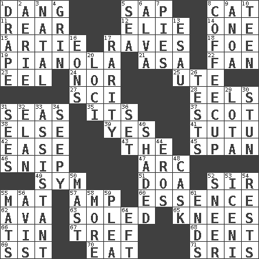 ACROSS 1. Mild oath, euphamism for damn 5. Plant excrement 8. Feline 11. Posterior 12. Writer Wiesel 14. Single 15. Nick name for Arthur 17. All-night dance parties 18. Enemy 19. Player piano 21. White ___ sheet 22. Avid follower 23. Snakelike fish 24. Or not 25. Shoshoni 27. _-fi 28. Snakelike fish 31. Oceans 35. It is 37. Highlander 38. Otherwise 39. Consenting reply 41. Ballerina skirt 42. Comfort 43. Definite Article 45. Connect, as a bridge 46. Clip 47. Curve 49. Symbol (abbr.) 51. ___ good deed 52. Title for a knight 55. Floor protector 57. Electrical Unit 60. Center 62. Actress Gardner 63. Having a sole or soles 65. Leg joints 66. Metal container 67. Not kosher 68. Scratch 69. Fast jet (abbr.) 70. Erode 71. Indian titles of respect DOWN 1. Window treatment 2. Nest on high 3. Relating to or accompanying birth 4. Smile widely 5. Ocean 6. Inventor's middle name 7. Sliced desserts 8. Java holder (2 wds.) 9. Small Philippine buffalo 10. Adolescent 13. He sold his birthright 16. Immeasurably long periods of time 17. Noteworthy scarcity 20. Event scenes 26. Trials 29. Globular water bottle used in Asia 30. Surprise greatly 31. Perceives with the eye 32. Enthusiasm 33. Helper 34. Oozy 36. Put into a specified state 40. Cast a shadow over 44. Greek god of love 48. Keg 50. Vertical spar for supporting sails 52. Scornful expression 53. Ancient Celtic tribe of eastern Britain 54. Musical pauses 55. Floor protectors 56. Deliberation 58. Greater amount 59. Entreaty 61. Extremities 64. Lizard (obsolete)