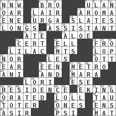 ACROSS 1. Compass dir. 4. Sis' sibling 7. ____ Bator, Mongolia 11. Rowing implement 12. Den 13. Scent 14. Compass dir. 15. Capital and largest city of Mongolia 16. Chalkboards 17. Yearns 19. Aide 21. Had dinner 23. _ vera 24. An absolute certainty 25. Pipe bend 26. From 29. Pale purple color 30. Mountains (abbr.) 31. Chop off 32. Or not 33. French article 34. Baseball player Mel 35. Ewer handle 36. Car or cant ending 37. Paris' subway 40. Cuckoo 41. Plus 42. Hindu Mythology: god of death 43. Australian parrot (variant) 45. Compass dir. 46. Home 51. Supplementing with great effort 55. Declaimed 56. Hang loosely or laxly 58. The 19th letter of the Greek alphabet 59. Carrier 60. Washington bills 61. Followers of ems 62. SW Saudi Arabia district 63. 23rd letter of the Greek alphabet 64. Floor covering DOWN 1. Christmas carol 2. Billionth: prefix 3. Songbird 4. Long, evenly shaped piece 5. Capital of Latvia 6. Mouths or openings 7. A salt of uric acid 8. Globular water bottle used in Asia 9. So be it 10. Political cartoonist Thomas 12. A period of five years 13. In addition 16. Beverly of Met fame 18. Highlander 20. Table seasonings 22. And so on (abbr.) 24. High-altitude cloud 25. Make improvements or corrections to 26. Plants 27. Printing process, for short 28. Elect 29. Grant temporary use of 32. Teachers' org. 33. Soviet premier 1918-24 36. Having ears or earlike features 37. Madame (abbr.) 38. Artist's stands 39. Long journey 43. 61 cubic inches 44. River in Europe 46. Roll call or roster of names 47. Greek god of love 48. Suttee (variant) 49. Hoof sound 50. Immeasurably long periods of time 52. A whole individual unit 53. Nanny 54. Abrupt rush of wind 57. Luau accessory