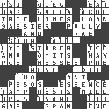 ACROSS 1. 23rd letter of the Greek alphabet 4. Cassini of fashion 8. Ingest 11. Boat paddle 12. An organ shaped like a helmet 14. 43,560 square feet 15. Relationship diagram 17. Citrus fruits 18. Grant temporary use of 19. More disrespectful 21. Friendly 23. Added to 24. Actress Charlotte 25. Make senseless or dizzy 27. Toward shelter 30. Sodium hydroxide 31. A viewer who gazes fixedly 34. Frozen water 37. Santa ___, CA 38. Leaves out 39. Fifth month 40. Personal Computers (abbr.) 41. Makes clutter 43. Before (prefix) 44. French philosopher Descartes 45. Prepare for publication 47. Nilotic language 49. Black tropical American cuckoo 50. Mexican monetary units 52. Core 56. Pack (down) 57. Musical pauses 60. Place where flour is made 61. Musical composition 62. Empty; void 63. Cards in a Roman deck? 64. Slender fish 65. Connect, as a bridge 66. Night before a holiday DOWN 1. Cooking vessels 2. "Two Mules for Sister ____" 3. Angers 4. Stared 5. Den 6. Shade tree 7. Turn to the right 8. Learning spot: Fr. 9. Like ___ of sunshine 10. Nine, plus one 13. Viper 14. Silent film actress Nazimova 16. He sold his birthright 20. Taverns 22. "We ___ not amused" (Victoria) 25. Synchronize (abbr.) 26. Afternoon social gatherings 27. Get up 28. Allows 29. Celtic language 30. Pet locale 32. Heavy book 33. So be it 34. Body of Kaffir warriors 35. Haul 36. Sight organ 42. Elected reps. 44. Friend of Pooh 46. South Vietnam president (1954) 47. Arboreal primate 48. United States Postal Service (abbr.) 49. NE Netherlands city 50. Dad 51. Indian title of respect (Mr.) 52. Inactive volcano in Sicily 53. The longest river in the world 54. 154 in Roman numerals 55. Writer Wiesel 56. Coat; cloak 58. Followers of ems 59. Plant excrement