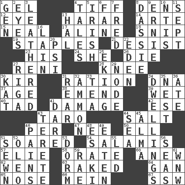 ACROSS 1. Set 4. Small quarrel 8. Habitations of wild animals 12. Sight organ 13. Ethiopian city, capital of Harari 14. Johnson of "Laugh-In" 15. Be tempered by heat 17. Place in a line 18. Sever or remove by pinching or nipping 19. Paper fasteners 21. Cease 23. Part of HMS, perhaps 24. A female animal or person 26. Pass on 27. Painter Guido (1575-1642) 28. Leg joint 30. Apertif with cassis 31. Food allowance for one day 34. Heredity factor (abbr.) 37. Personal question 38. Make improvements or corrections to 39. Soggy 40. Small amount or degree 41. Break 42. Compass dir. 43. Edible starchy tuberous root 44. Table seasoning 46. For each 47. Born 50. Pipe bend 51. Flew 54. Deli grouping 57. Writer Wiesel 58. Declaim 60. Afresh 62. Gone 63. Moved through 64. Separate the seeds from cotton 65. Sense of smell 66. Count _ (2 wds.) 67. Compass dir. DOWN 1. Commissioned military rank (abbr.) 2. Snake ____ (dice throw) 3. Resembling or made to resemble leather 4. Stories 5. From or relating to Ireland 6. Air blower 7. Flintstone 8. Hyrax 9. Bert's buddy 10. Nuclear Threat Initiatives 11. Back-to-school mo. 13. Actor Linden 16. (Had) reclined 20. Air pressure measure (abbr.) 22. Genesis locale 25. Supplementing with great effort 27. Port city in Latvia 29. Connecting point 30. Krazy ___ of comics 31. Stern 32. ID or VA city 33. Afternoon social gathering 34. Residences 35. A home for chicks 36. Had dinner 41. Have the gumption 43. Cylindrical with tapered ends 44. Ocean 45. _ mater 46. Aches 48. 1973 Nobel Price Winner (Physics) Leo 49. Ingested 51. Stitched 52. Margarine 53. Dormintory (informal) 55. Directed 56. Oceans 59. Actress Charlotte 61. Compass dir.