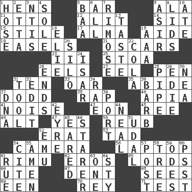 ACROSS 1. Coop moms 5. Oblong piece of solid material 8. Insect wing 11. Von Bismarck 12. Came down and settled, as after flight 14. Be seated 15. Vertical member of a panel or frame 17. _ mater 18. Assistant 19. Artist's stands 21. Motion picture awards 23. One more than two 25. Portico 26. Snakelike fish 27. Snakelike fish 28. Animal enclosure 31. Nine, plus one 33. Rowing implement 35. Remain 37. Texas town _ City 38. Hit sharply and swiftly 40. Capital of Western Samoa 41. Annoying sound 43. Period of immesurable duration 45. To riddle 46. Keyboard modifier key 47. Affirmative reply 50. Reuben's nickname 52. Part of Q.E.F. 53. Bit 54. Device for capturing images 56. Portable computer 61. Tall New Zealand timber tree 62. Greek god of love 65. Nobles 66. Shoshoni 67. Gouge 68. Perceives with the eye 69. Car or cant ending 70. Marina Del _, California 71. Trial DOWN 1. Flexible conduit 2. Singer James 3. Nuclear Threat Initiatives 4. Not divided or shared with others 5. Sound made by sheep 6. Everything 7. Full of chinks, cracks, or crevices 8. SW Saudi Arabia district 9. Hats (slang) 10. Had dinner 13. Clothes sense 16. Writer Wiesel 18. Auto club (abbr.) 20. Grain storage tower 22. Root beer relative 24. Austrian river, tributary to the Danube 26. Extremities 28. Corncob 29. Singer Brickell 30. Teachers' org. 31. Implement 32. Prepare for publication 34. Actress Charlotte 36. Sharp remark 37. Heredity factor (abbr.) 39. Sweet dark-red dessert wine 42. Jane of fiction 44. Be tempered by heat 48. Having ears or earlike features 49. A viewer who gazes fixedly 51. Allodial 52. Australian flightless bird 54. Quote 55. So be it 57. Mail 58. Woody plant 59. Lyric poems 60. Inconspicuous attention getter 61. Regret 63. Single 64. Filthy place
