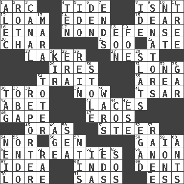 ACROSS 1. Curve 4. Periodic rise and fall of the sea level 8. Is not 12. Rich soil 14. Paradise 15. Letter starter 16. Inactive volcano in Sicily 17. Unrelated to defense, as in spending 20. Burn to charcoal 21. "Barney Miller" actor Jack 22. Had dinner 23. Member of a famous L.A. basketball team 27. A home for chicks 29. Angers 31. Protracted 34. Distinguishing feature 35. Length times width 36. "Corrida" creature 39. At this time 41. Russian ruler of old 42. Collude with 43. Shoestrings 46. Open wide 47. Greek god of love 48. Mouths or openings 51. Navigate 54. And not 56. Commissioned mil. rank 58. Greek goddess of the earth (variant) 61. Pleas 66. Soon (poet.) 67. The main thing one is thinking about 68. _ china 69. Incision 70. Old wives' tales, e.g. 71. Backtalk 72. Curvy letter DOWN 1. Actor Baldwin 2. Writer of Portnoy's Complaint (1969) 3. Lessep's creation 4. "___ Little Indians" 5. Wedding promise 6. Lair 7. Extremities 8. Binary compound 9. Legislators 10. Political cartoonist Thomas 11. Family _ (genealogy) 13. Hindu Mythology: god of death 18. Period of immesurable duration 19. Enemy 24. Apertif with cassis 25. Period 26. It's straight from the horse's mouth 28. Narrow boards 30. Took without asking 32. Teachers' org. 33. Slender fish 34. Carrier 36. Label 37. Chief or king in Benin or Nigeria 38. News announcer 40. Armed conflicts 44. Small bed 45. Compass dir. 49. Ripen 50. Ocean 52. Mild oath 53. The wife of a rajah (variant) 54. Famous astronaut Armstrong 55. Southwest Nigerian state 57. Nuclear Threat Initiatives 59. Charged atoms 60. Pismires 62. Actress Charlotte 63. _ tizzy (2 wds.) 64. Begley and Asner 65. Distress signal