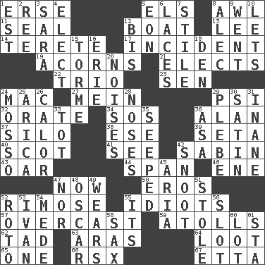 ACROSS 1. Celtic language 5. Raised railways 8. Leather borer 11. Lick closed 12. Water vessel 13. Area sheltered from the wind 14. Cigar-shaped 17. Happening 19. Oak nuts 21. Opts 22. Musical group of three 23. Elected rep. 24. Apple computer (short form) 27. Count _ (2 wds.) 29. 23rd letter of the Greek alphabet 32. Declaim 34. Distress signal 36. Actor Alda or Thicke 37. Grain storage tower 38. Compass dir. 39. Bristle 40. Highlander 41. Perceive with the eye 42. Unit of acoustic absorption 43. Rowing implement 44. Connect, as a bridge 46. Compass dir. 47. At this time 50. Greek god of love 52. Full of chinks, cracks, or crevices 55. Foolish or stupid persons 57. Cloudy 59. Ringlike coral islands and reefs 62. Small boy 63. Ancient river in northeast Turkey 64. Spoils 65. Single 66. Acura sports coupe 67. Singer James DOWN 1. Eastern Standard Time (abbr.) 2. To separate or throw off 3. "Two Mules for Sister ____" 4. Voters do this 5. Age 6. Shoestrings 7. Vertical member of a panel or frame 8. Actor Baldwin 9. Left 10. Allows 12. Altar cloth linen 15. Singer Mel 16. One of the Great Lakes 18. Lair 20. Annoying sounds 24. With motion or animation 25. N. Chile seaport 26. Bodily heat indicating an inflammation 28. Olfactory organs 29. Cadet 30. Smooth fabric 31. Silly 33. Small child 35. Oozed 36. White ___ sheet 42. Snob 45. Operatic vocal solo 47. Or not 48. Witty Wilde 49. Puts on (as clothing) 51. Took without asking 52. Printing process, for short 53. "Terrible" tsar 54. Ancient Persian 55. It is 56. Slit 58. Saxophone 60. Car dealer's back yard 61. R.R. building