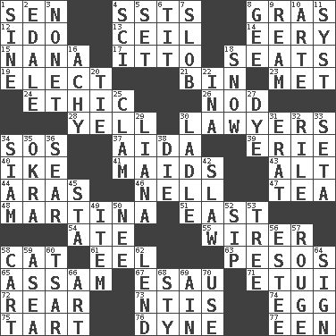 ACROSS 1. Elected rep. 4. Fast planes 8. Pate de foie ____ 12. Wedding promise 13. To provide with a ceiling 14. Suggestive of the supernatural 15. Grandmother 17. "Tell ____ the Marines!" 18. Theater features 19. Voters do this 21. Storage container 23. Was introduced to 24. Moral principle 26. Lower and raise head in agreement 28. Shout 30. Those who practice law 34. Distress signal 37. Opera by Verdi 39. One of the Great Lakes 40. D.D.E's nickname 41. Unmarried girls 43. Keyboard modifier key 44. Ancient river in northeast Turkey 46. 1994 drama film starring Jodie Foster 47. Afternoon social gathering 48. Chrissie's court nemesis 51. Compass direction 54. Had dinner 55. One who wires 58. Domesticated feline 61. Snakelike fish 63. Mexican monetary units 65. Indian state 67. Son of Isaac 71. Needle case 72. Bring up, as a child 73. Nuclear Threat Initiatives 74. Ovum 75. Small pie 76. Centimeter-gram-second unit of force 77. Car or cant ending DOWN 1. Trig term 2. Peak District village in England 3. Music written for nine 4. _-fi 5. Put into a specified state 6. Teat (slang) 7. Messy guy 8. Turn to the right 9. 480, 500 or 516 sheets of paper 10. Johnson of "Laugh-In" 11. System (abbr.) 16. Painful 18. Overwhelm 20. Make a knot 22. _ tizzy (2 wds.) 25. Dollar (slang) 27. Color 29. Woody, climbing, usually tropical plant 30. Dipping utensil 31. Part of Q.E.F. 32. Cause heat under the collar 33. Bristle 34. Thailand, formerly 35. Gumbo ingredient 36. Dry up 38. Pass on 42. Cole _ (cabbage dish) 45. R.R. building 49. A whole individual unit 50. Born 52. Small drink 53. Woody plant 56. First name in cosmetics 57. Makeup applied to the cheeks 58. Draw slowly or heavily 59. Toward the sea 60. Russian ruler of old 62. Grant temporary use of 64. Attach a signature 66. Nonscientific branch of learning 68. Filthy place 69. The 18th letter of the Arabic alphabet 70. Purpose