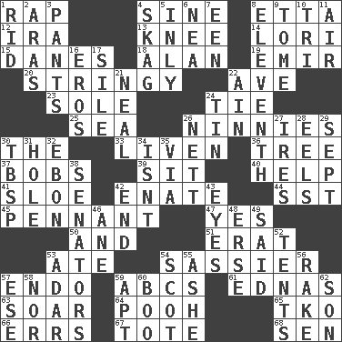 ACROSS 1. Reproach for some lapse or misdeed 4. Trig term 8. Singer James 12. Lyricist Gershwin 13. Leg joint 14. Australian parrot (variant) 15. Natives or inhabitants of Denmark 18. Actor Alda or Thicke 19. Independent ruler or chieftain 20. Slender, wiry 22. "___ Maria" 23. Not divided or shared with others 24. Standoff 25. Ocean 26. Simpletons 30. Definite Article 33. Make or become more lively 36. Family _ (genealogy) 37. Moves up and down 39. Be seated 40. Aid 41. _ gin 42. Related on the mother's side 44. Fast jet (abbr.) 45. Pre-World Series prize 47. It is so 50. Plus 51. Part of Q.E.F. 53. Had dinner 54. More impudent 57. Inside; within (prefix) 59. Lettered men learn these first 61. Ferber et al. 63. Fly high 64. "Silly old bear" 65. Ring climax 66. Blunders 67. Carryall 68. Elected rep. DOWN 1. To free from 2. Caspian sea tributary 3. Leg coverings 4. Heroin 5. In an inward manner 6. Teachers' org. 7. Car or cant ending 8. Veterans Day date 9. Heavy book 10. Three (prefix) 11. Atmosphere 16. Greek god of love 17. Filth; sediment 21. Actress Patricia 22. The 18th letter of the Arabic alphabet 24. Shallow baking pan 26. Remaining after all deductions 27. Angers 28. Snakelike fish 29. Back-to-school mo. 30. Cook's measure (abbr.) 31. Hollow 32. Inky black, to poets 34. Is not 35. By way of 38. Elected representatives 42. Conclude 43. Sight organs 46. One (Scot) 48. Celtic language 49. Stated 52. Portable shelters 53. The sixth month of the Jewish calendar 54. Highlander 55. American tennis player Robert 56. Immoral or dissolute person 57. Compass dir. 58. Not either 59. Fitting 60. Oct. 31 cry 62. Manchild