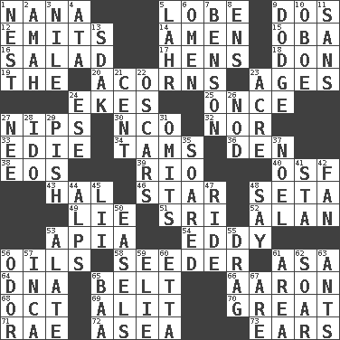 ACROSS 1. Grandmother 5. Ear part 9. Two (Sp.) 12. Gives off 14. So be it 15. Chief or king in Benin or Nigeria 16. Vegetable dish 17. Coop moms 18. Spanish title 19. Definite Article 20. Oak nuts 23. Eras 24. Supplements with great effort 25. Single time 27. Pinches, bites 30. Non-commissioned officer (abbr.) 32. Not either 33. Singer Brickell 34. Scottish caps 36. Lair 38. Greek goddess of the dawn 39. _ de Janeiro 40. Order of Saint Francis (abbr.) 43. Actor Linden 46. Play the lead 48. Bristle 49. Whopper 51. Indian title of respect (Mr.) 52. ____ Jay Lerner 53. Capital of Western Samoa 54. Whirlpool 56. Petroleums 58. Sowing specialist 61. White ___ sheet 64. Heredity factor (abbr.) 65. Waist strap 66. Composer Copland 68. Sep. follower 69. Came down and settled, as after flight 70. Relatively large 71. Actress Charlotte 72. Toward the sea 73. Hearing organs DOWN 1. Egg locale 2. Wet nurse 3. "Death on the ____" 4. _ moment's notice (2 wds.) 5. Cowardly lion portrayer 6. Sign of something about to happen 7. Gillaume's butler role 8. Followers of ems 9. Evade 10. Mitch Miller's instrument 11. Without 13. Neighbor of Neb. 21. Penny 22. Motion picture awards 23. 43,560 square feet 24. Compass dir. 26. Lower and raise head in agreement 27. Born 28. Wedding promise 29. Expression of disdain 31. Leaves out 35. Flew 37. Christmas carol 41. R.R. building 42. Air blower 44. High mountains 45. Cards in a Roman deck? 47. Travel on or in a vehicle 48. Declare 50. Artist's stands 53. Having winglike extensions 55. To be drawn or hauled along 56. Aroma 57. South American Indian 59. Writer Wiesel 60. Singer James 61. Length times width 62. Fly high 63. Pismires 65. Sound made by sheep 67. "We ___ not amused" (Victoria)