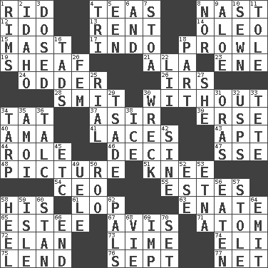 ACROSS 1. To free from 4. Afternoon social gatherings 8. Political cartoonist Thomas 12. Wedding promise 13. Monthly bill 14. Margarine 15. Vertical spar for supporting sails 17. Southeast Asian peninsula 18. Move like a hungry wolf 19. Archer's quiver 21. Chicken ___ king 23. Compass dir. 24. More peculiar 26. Big collection agency 28. Stricken, poetically 30. Sans 34. Make lace 37. SW Saudi Arabia district 39. Celtic language 40. Housemaid (var.) 41. Shoestrings 43. Fitting 44. Hero or heavy, e.g. 46. Tenth: prefix 47. Compass dir. 48. Photo 51. Leg joint 54. Corporate head (abbr.) 55. _____ Park, CO 58. Part of HMS, perhaps 61. Chop off 63. Related on the mother's side 65. First name in cosmetics 67. Advice 71. Smallest unit of an element 72. Enthusiasm 73. Welles in "The Third Man" 74. Connecticut Ivy Leaguer 75. Grant temporary use of 76. Back-to-school mo. 77. Fish or hair follower DOWN 1. Basketball hoops 2. Potato state 3. Administered medicine 4. Three (prefix) 5. Car or cant ending 6. Added to 7. Portico 8. And not 9. _ vera 10. Stitched 11. Lacquered or enameled metalware 16. Small boys 18. Component 20. Opposite of masc. 22. Cards in a Roman deck? 25. Monetary unit of Yemen 27. A female animal or person 29. Sadhe (variant) 30. Raze 31. Mouths or openings 32. United States Postal Service (abbr.) 33. Wig 34. Canvas cover 35. Mine, in Marseilles 36. Baby powder 38. Frozen water 42. Trig term 45. And so on (abbr.) 49. Ubangi River tributary 50. Friend of Pooh 52. Compass dir. 53. Inactive volcano in Sicily 56. Ingested 57. Fur scarf 58. The bottom of a shoe or boot 59. Capri or Wight 60. Comedian Laurel of Laurel & Hardy 62. Friends 64. Give off 66. Conclude 68. Compete 69. Mischievous child 70. Arrange properly for use
